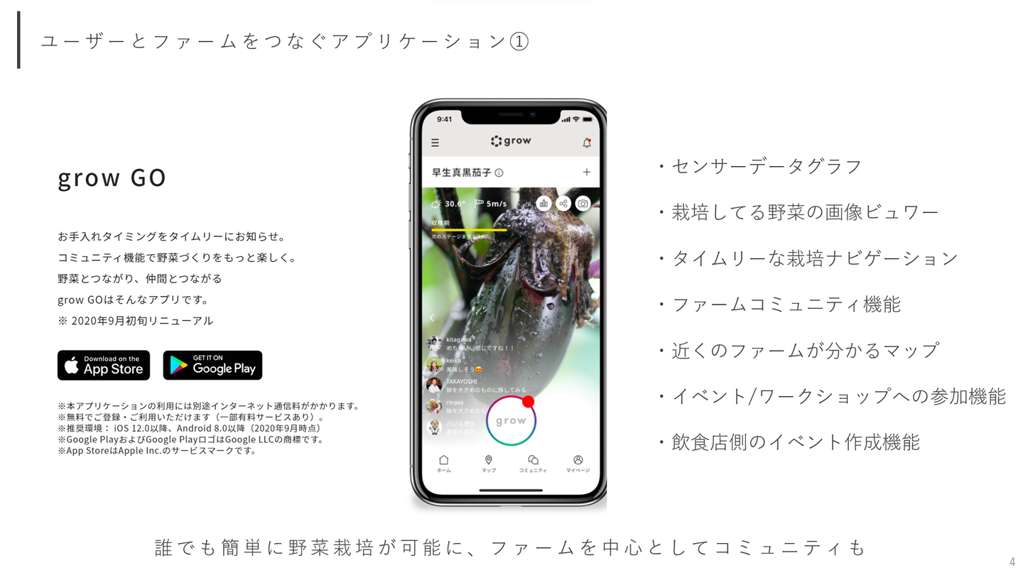 このようなマクロトレンドの中、わたしたちは祖父の「一般の方々が食と農に触れる機会を創出したい」という想いを現代にアップデートし、”grow”というプラットフォームを開発しています。