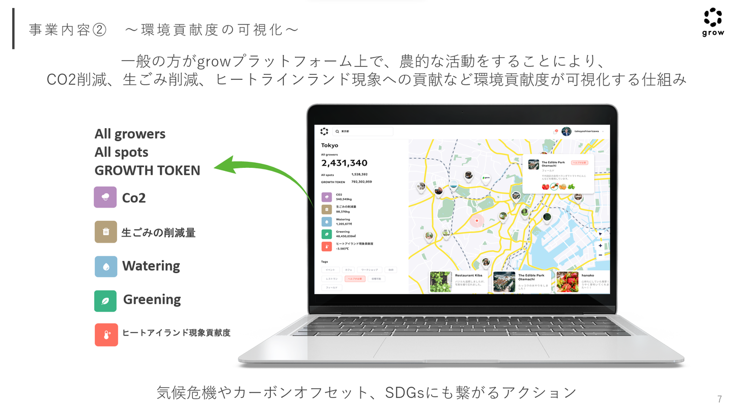 さらには、都市DXの流れを受け、どんどん地域通貨や仮想通貨、暗号通貨が台頭してきていますが、わたしたちの"grow"では、一部エリアで地域の都市OSと連携し、みなさんがgrowを使い「水やり」や「間引き」、「誘引」などのお手入れ(農的活動)を行って頂くとポイントがもらえ、それをクーポンに変換して使えるというトライアルも推進しています。
