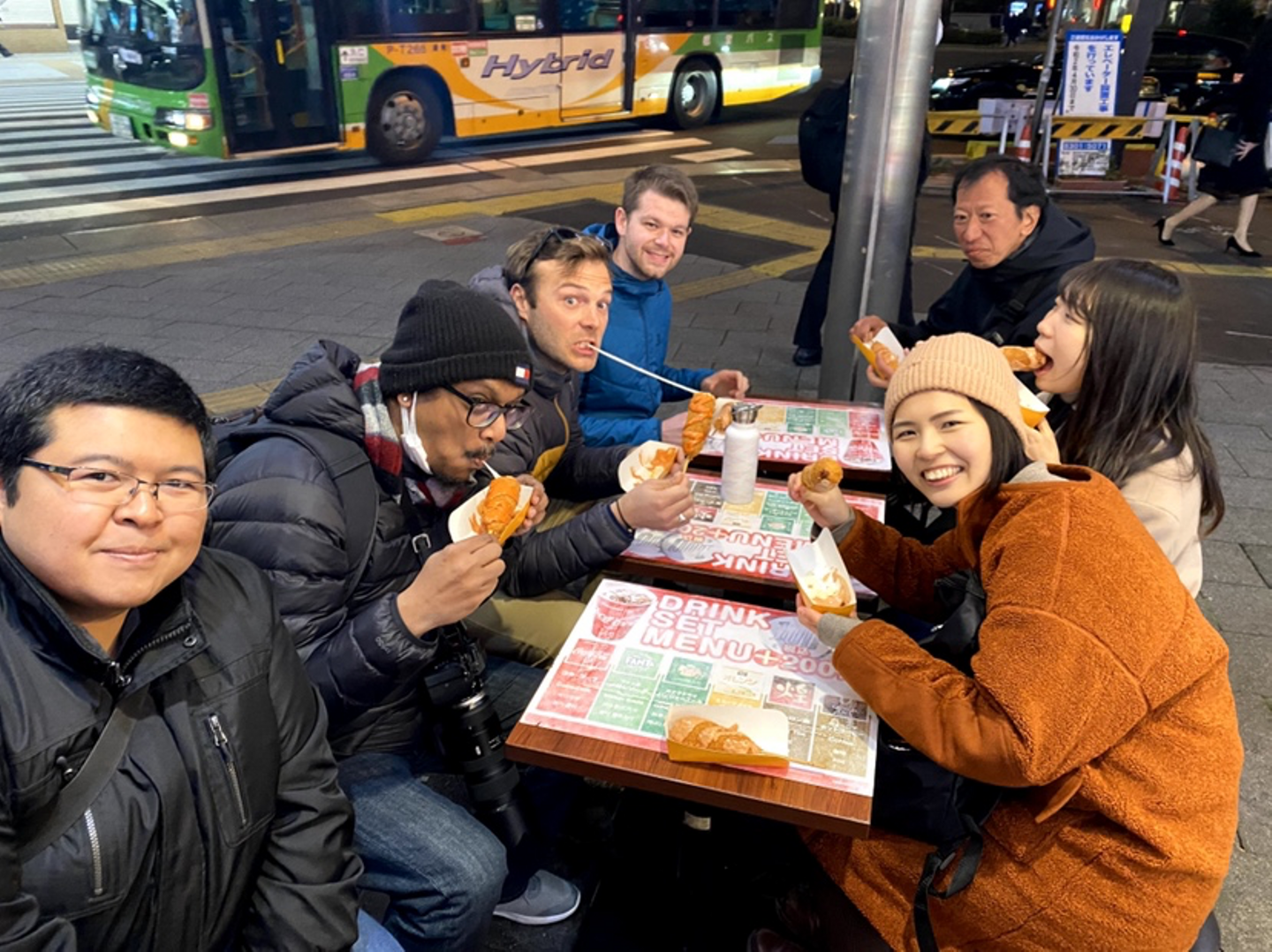 上)ゲストとの餃子パーティにて。欧米の方にとっては餃子作りも初体験。
