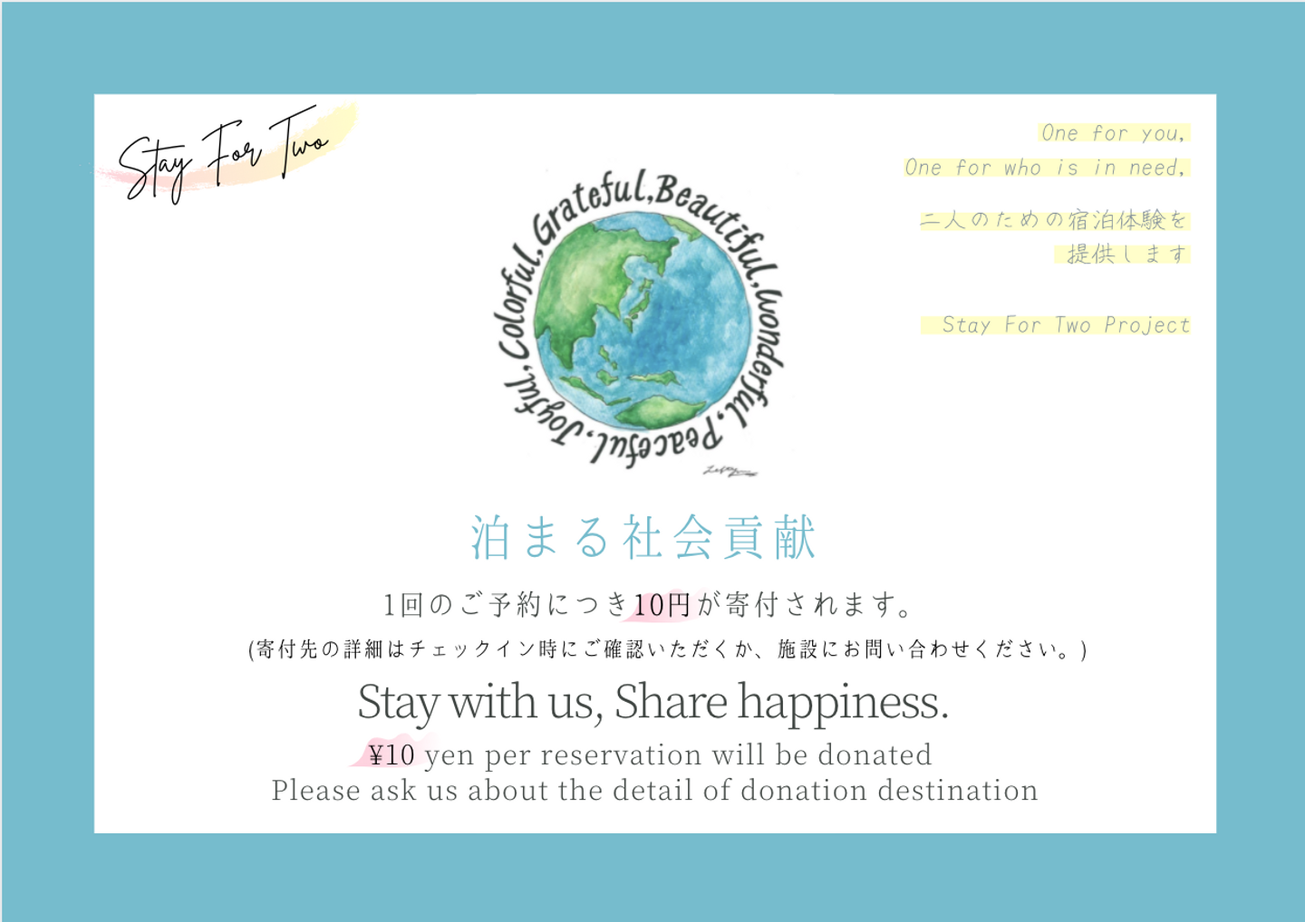 STAY FOR TWOは、”2人のための宿泊”を意味します。1人は実際に宿泊をするご宿泊者ご自身、もう1人は、宿泊料金を通じて支援を受ける1人。宿泊施設として、「泊まること」が誰かのためになる、社会貢献に繋がることで幸せが増える仕組みを作りたいという想いが込められています。