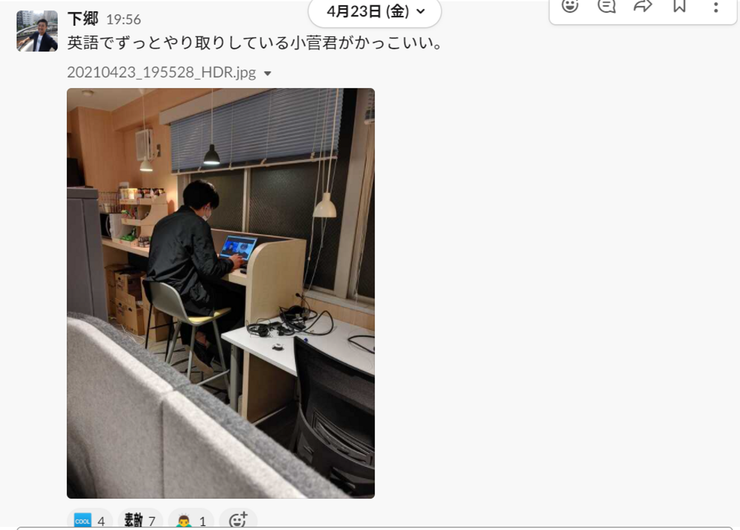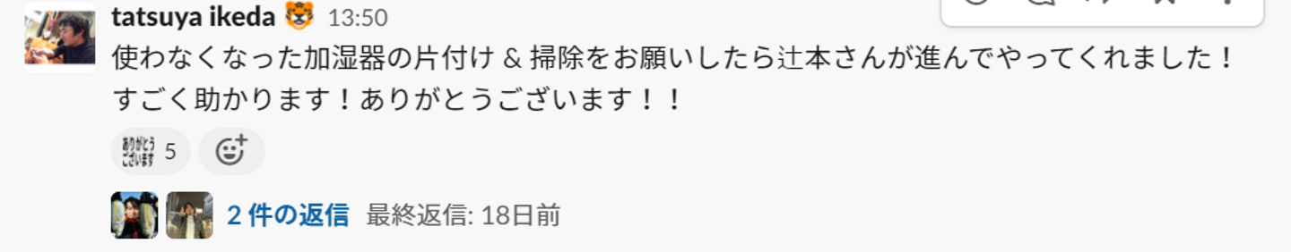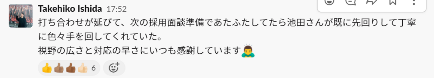 弊社がコミュニケーションツールとして利用しているslackの#praise with respectというルームで日々感謝やリスペクトを伝えあっています。