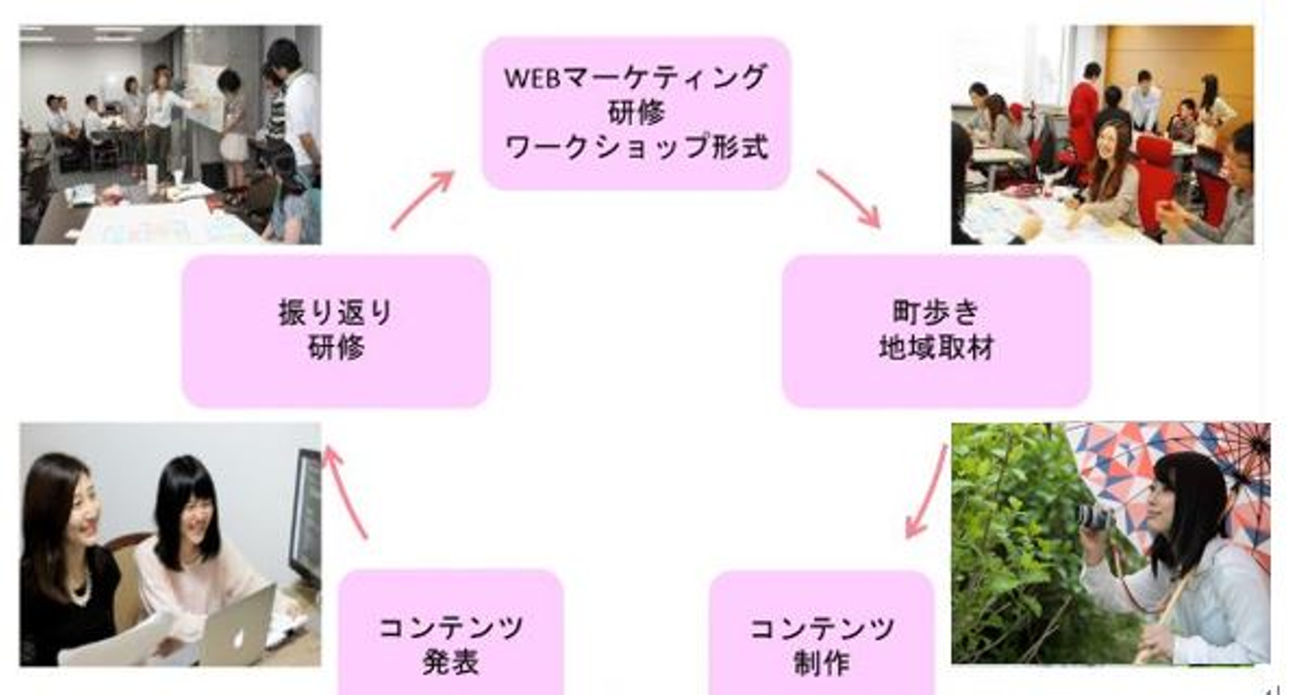 講習内容は、WEBマーケティングの基礎知識や、実際に街を歩いて取材、そしてコンテンツ制作までの研修が含まれています。