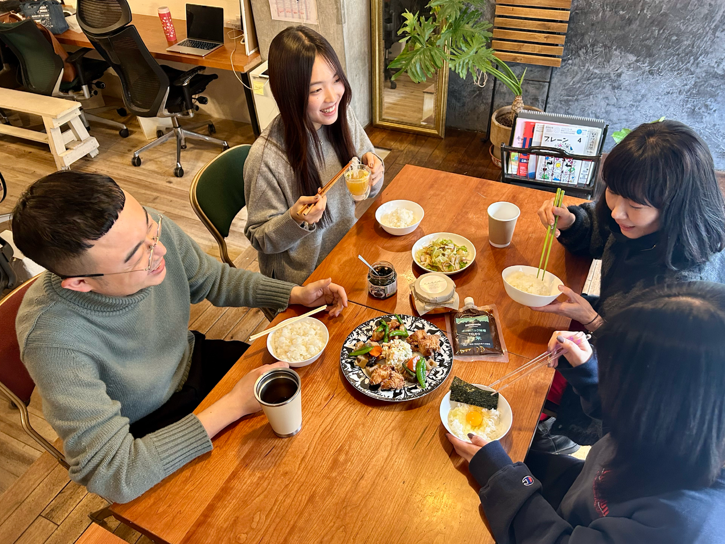 そこからの動きはとても早く、鈴木(通称:すーさん)が自宅から炊飯器を持ってきてくれたことで、一気に炊きたてごはんが食べられる会社に。毎朝、社内チャットで「今日ご飯食べる人いる?」とゆるく募集し、人数に応じて炊飯量を調整。忙しくて人数が読めない日に使われる「見切り3合炊き」という言葉、たぶん弊社だけの言葉です。