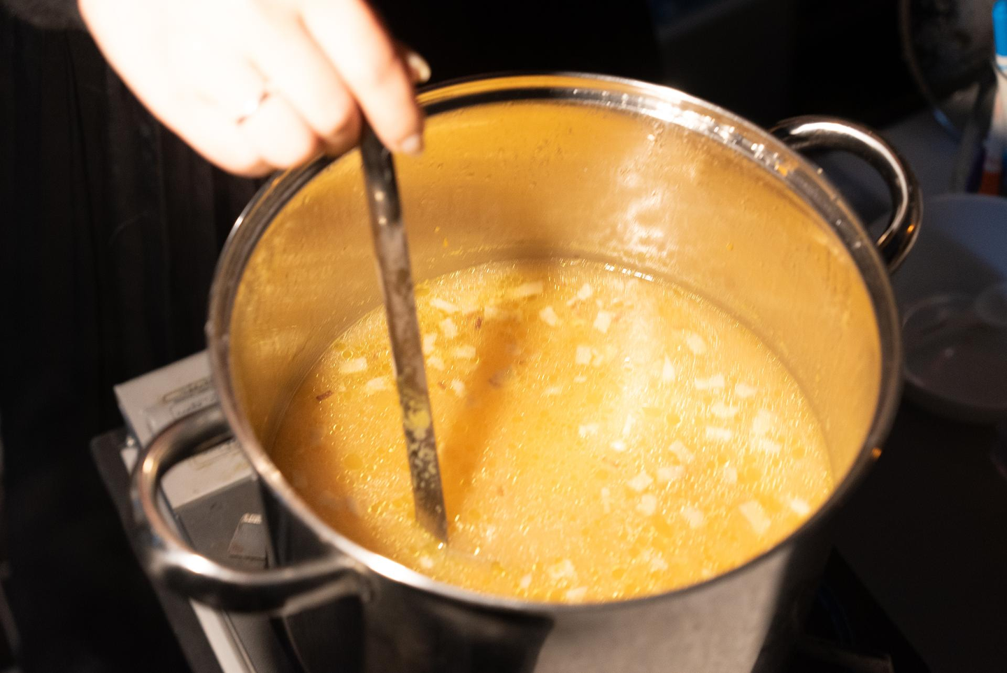 受付ではTESIO POWDERをベースにした野菜スープをご提供。寒い中いらっしゃったお客様にウェルカムスープとして召し上がっていただきました。微塵切りにしたにんじんとたまねぎ、細かく切ったベーコンとTESIO POWDERで完成。