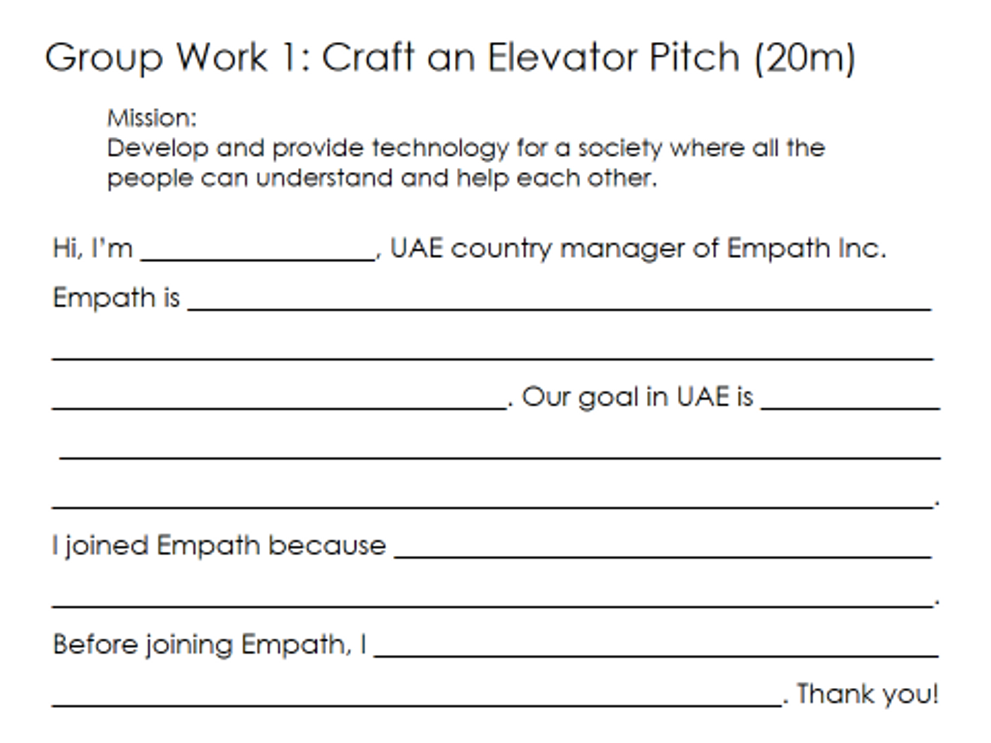 グループ・ワーク(1)では1.のEmpathの紹介をもとにしてチームでエレベーター・ピッチを作成してもらう。カントリーマネージャーは営業先で、展示会で、イベントで、はたまた投資家向けピッチコンテストで、何万回ものエレベーター・ピッチをすることになる。ここでは限られた時間の中で印象に残る簡潔な事業説明ができるかどうか(引き算ができるかどうか)をチェックするとともに、グループ内での意見の食い違いをどのように調整しているのかを観察する。また、プレゼンテーションそのものの能力もチェックする。