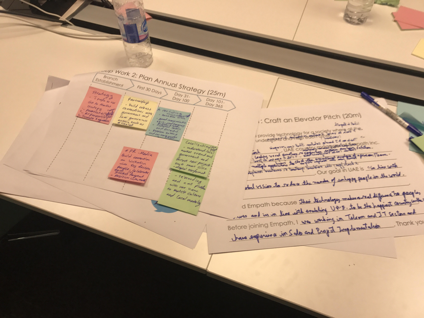 グループ・ワーク(2)ではUAEでEmpathを展開するにあたり最初の一年間の事業計画を立案してもらう。戦略、メディア・PR、パートナーシップ形成、採用、ローカライゼーションの5つの項目に関してチームで議論してもらい、その結果を発表してもらう。1年間の後に何を成果として残すべきかを考えた上で、各項目を考えていくことが重要だが、時間制限も厳しいため、なかなかまとまった戦略を発表できるチームは少ない。この課題ではチームを牽引できる力があるか、抽象的ではなく個別具体的かつ現実的な戦略を立案できるか、それを実施できるだけの人的ネットワークを有しているのかに注目する。
