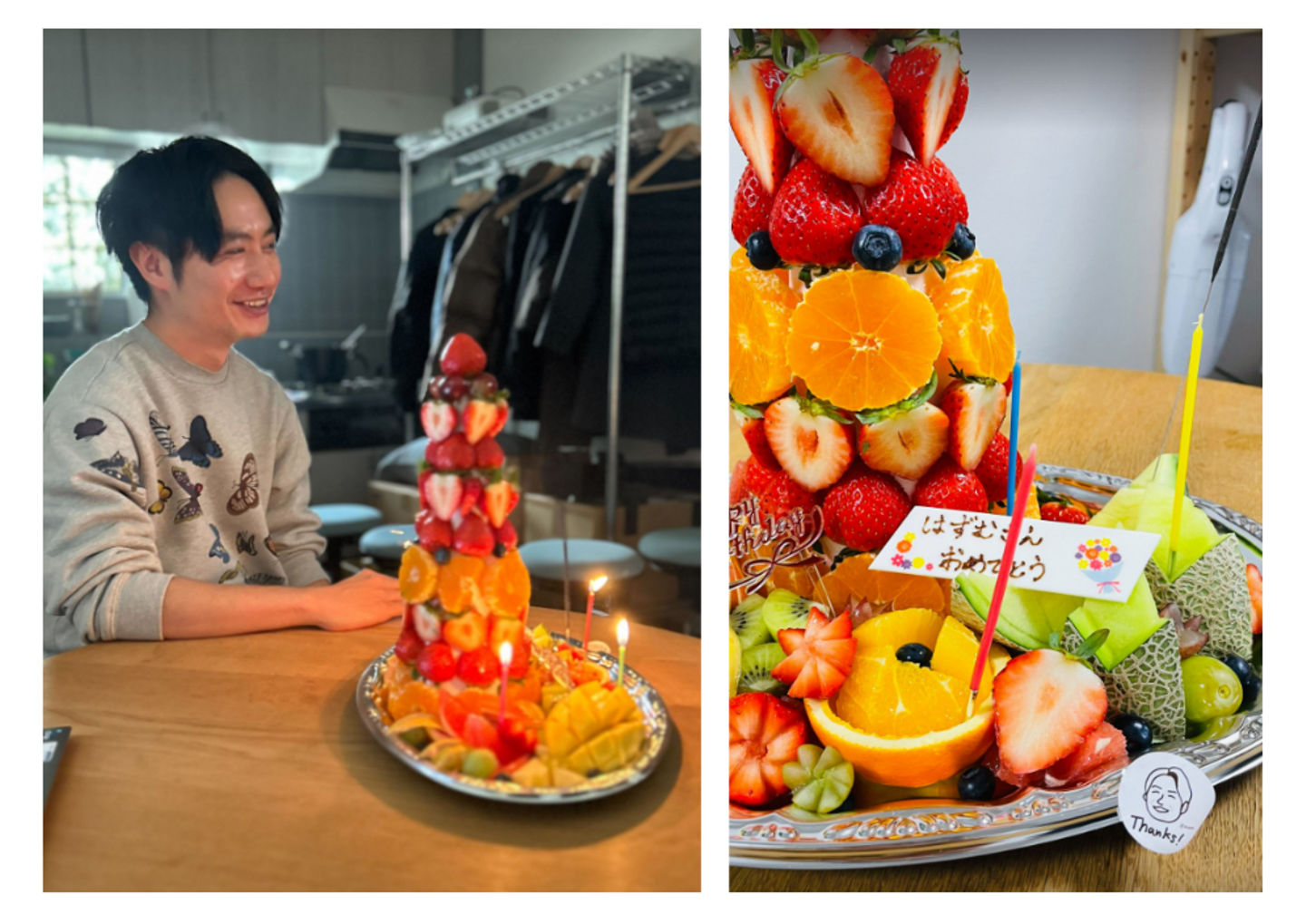 大きなフルーツタワーの登場に大喜び(?)のはずむさん!フルーツはおいしくメンバーも一緒にいただきました🍊🍓🥝