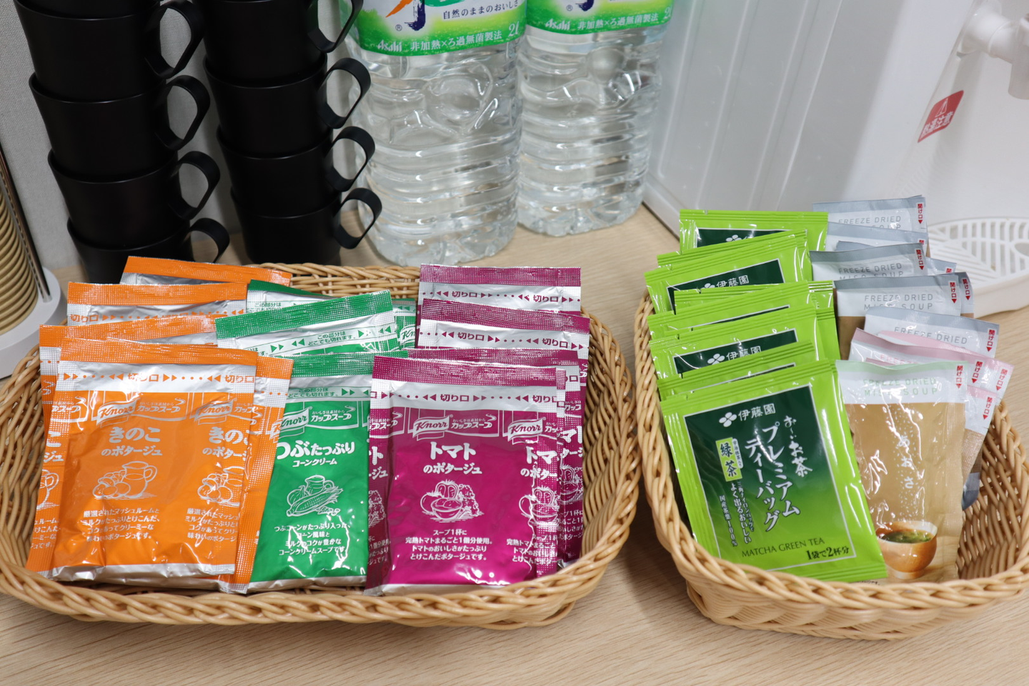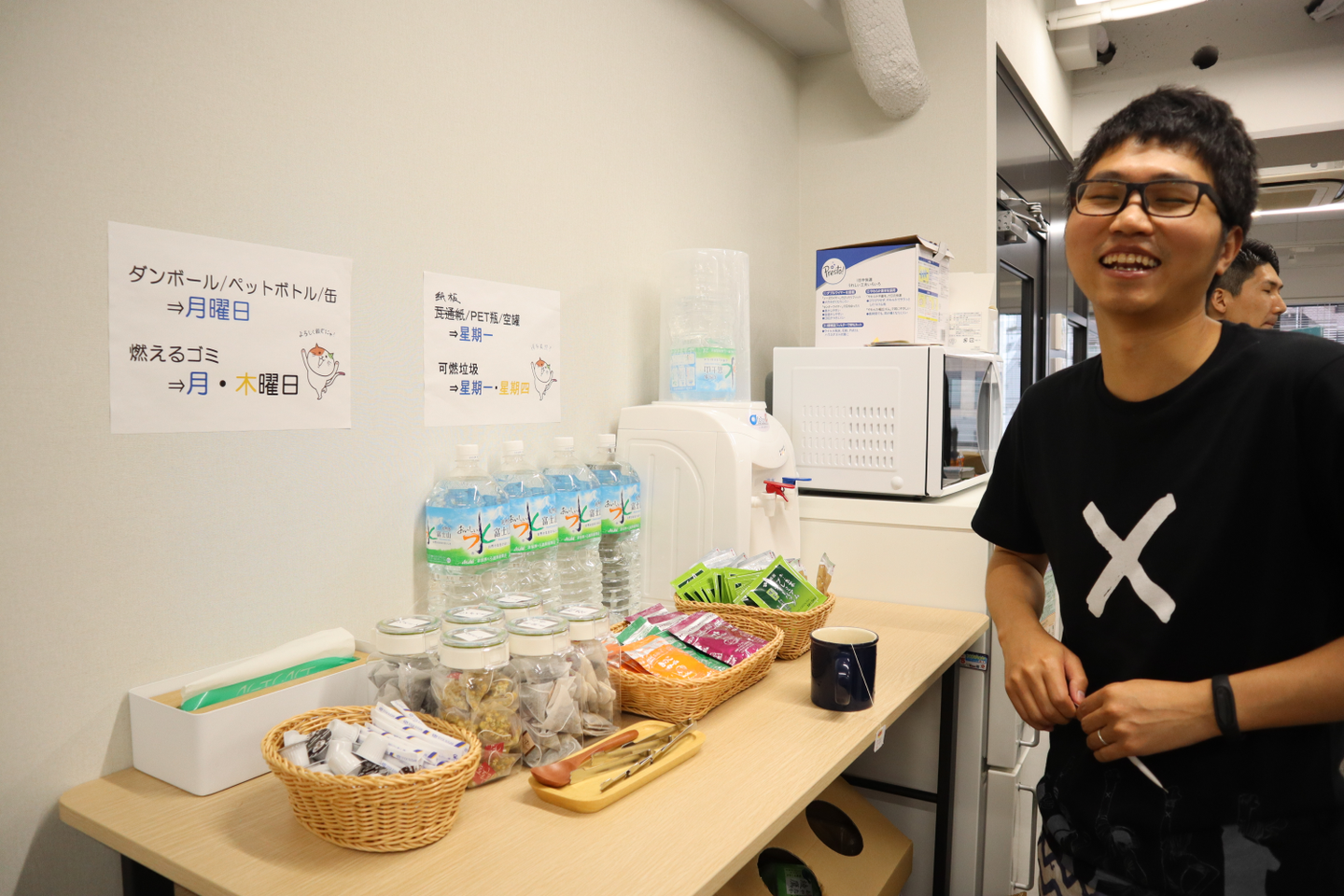 移転の際に、社員から最も要望が多かったドリンクバーとコーヒーメーカーの設置が大人の事情で叶わなかったため、手動ではありますがドリンクバイキングができるスペースを作りました!(嬉しそうなCTO!)
