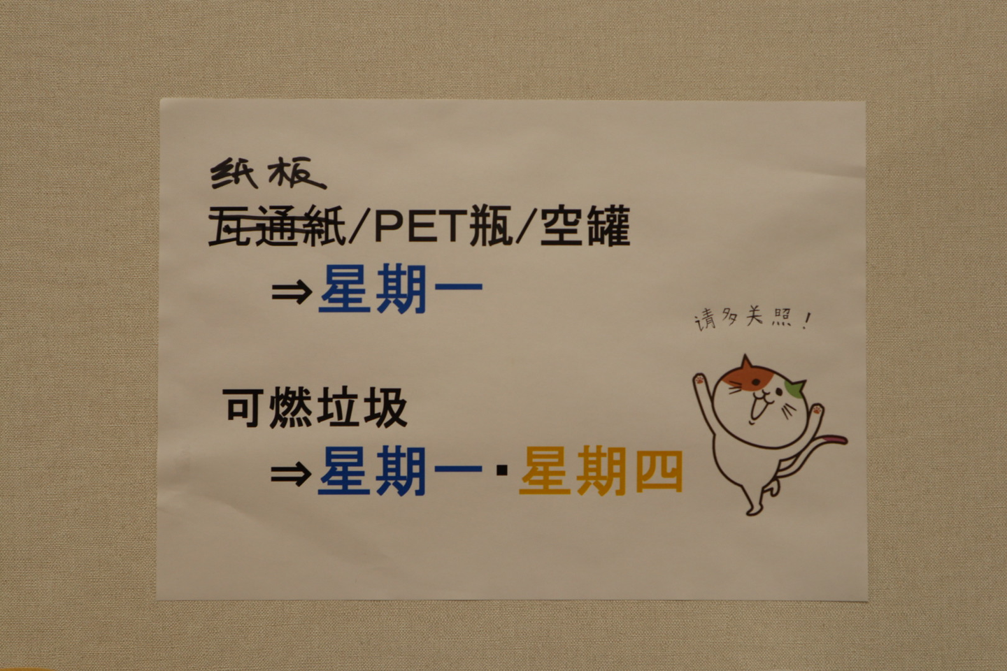 社内ルールなども出来る限り中国語で書くことで、社内の温度感にバラつきがでないよう心がけています。(曜日別ゴミ出しルール、間違えた箇所は中国人のエンジニアが直してくれました!笑)