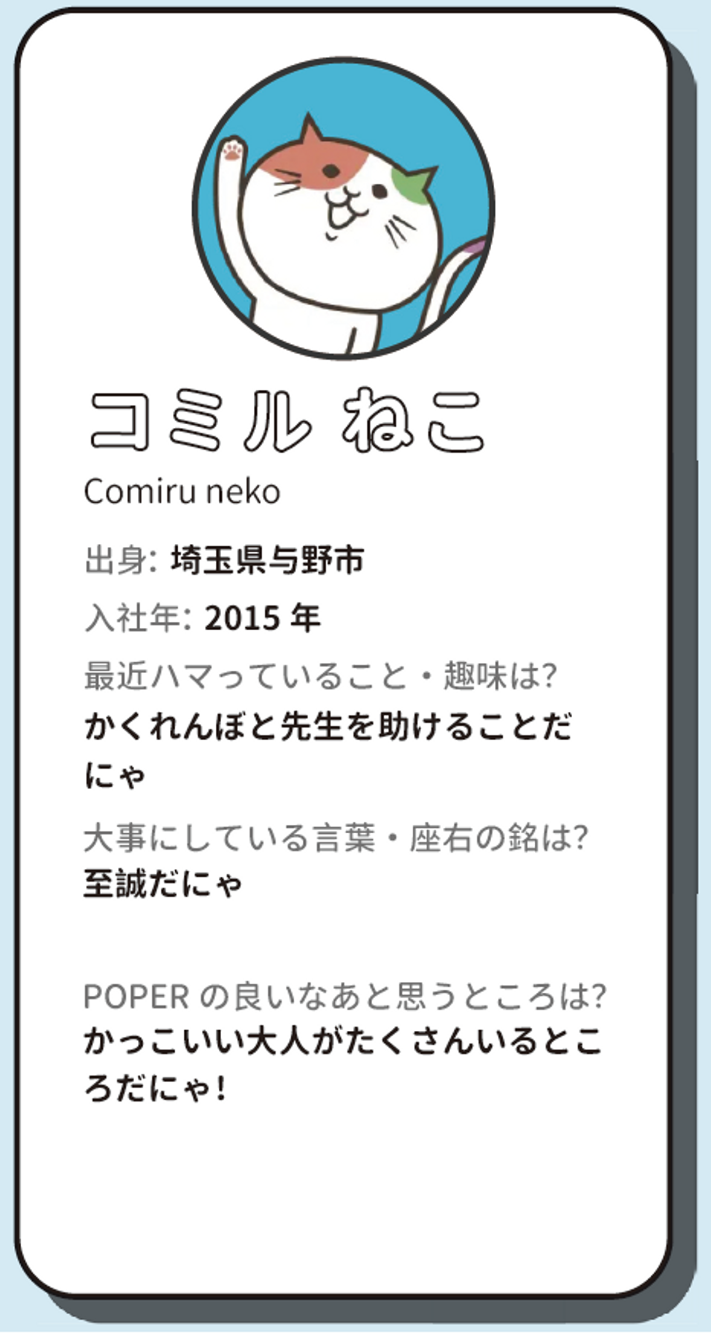 メンバー同士のコミュニケーションの一助になるように願いを込めて、全社員分の社員名鑑を掲載したり。(こちらは我らがコミルねこのプロフィールです😼💖)