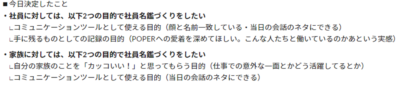 今回の目玉のひとつ、社員名鑑に関しては見てもらいたい相手がご家族とPOPERメンバーだったので、それぞれにとっての理想状態を決めてからどんな項目を冊子に入れるかをみんなで話し合いました。