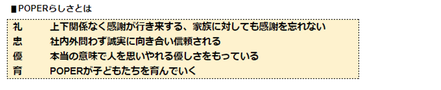 キックオフを経て、POPERらしいFamily Dayを作るためにも、まずはチーム内で”POPERらしさ”ってなんだっけ?をテーマにグループワークを行い、論語や四字熟語を掛け合わせて礼忠優育という造語をつくりました。