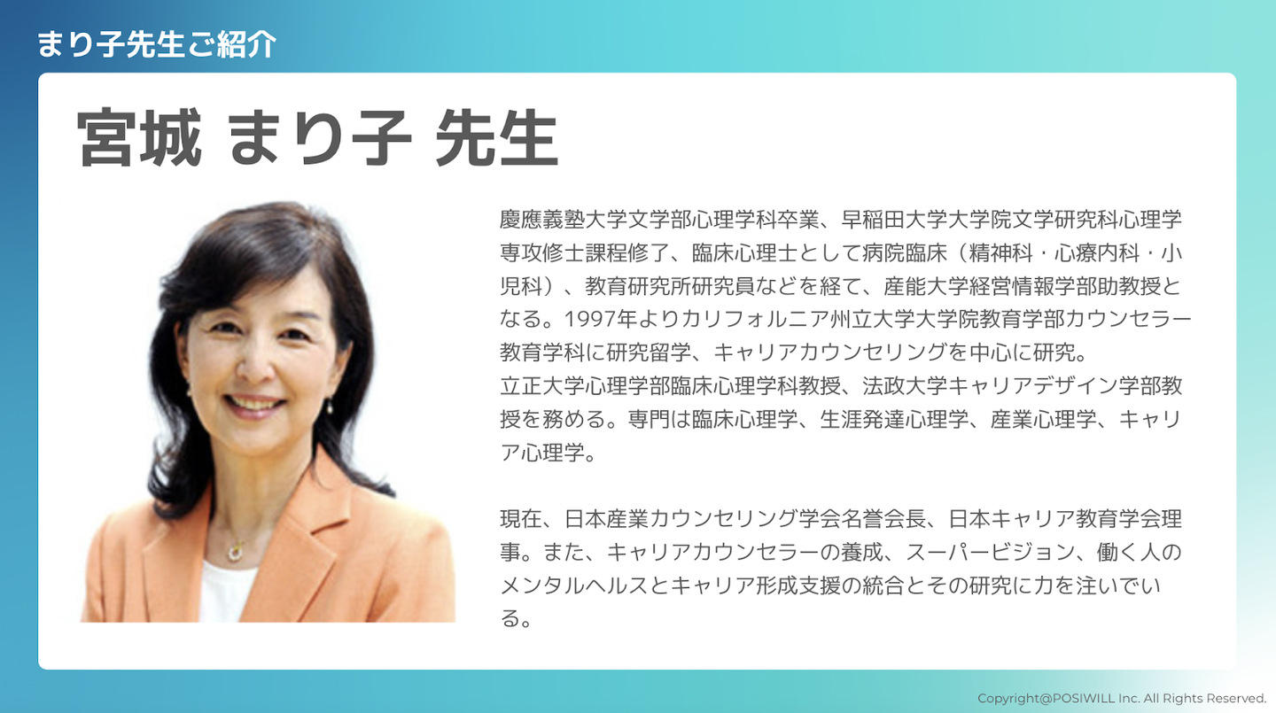 - 目的 :宮城先生のキャリアカウンセリングがポジウィルの原点であることを理解する