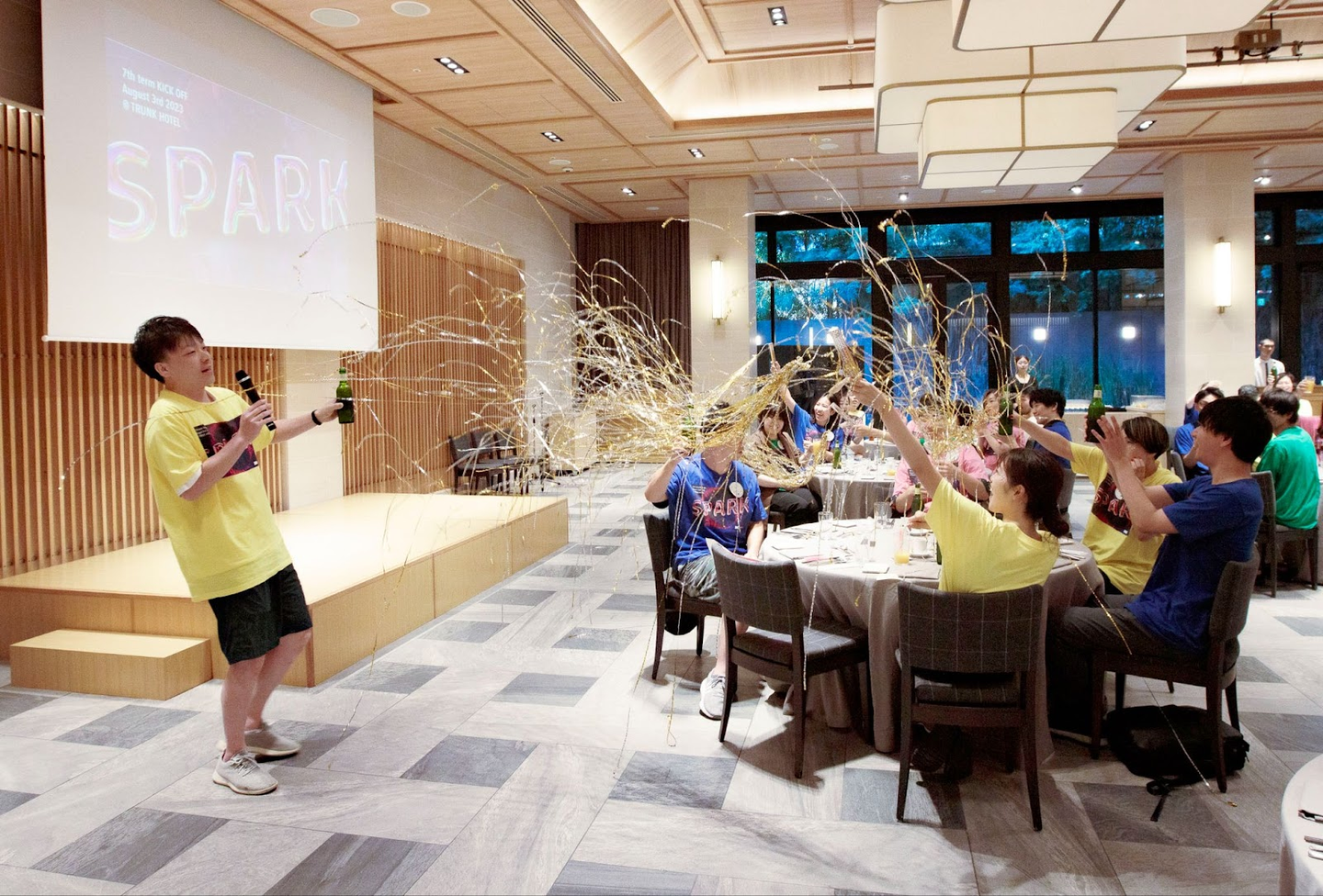ポジウィルでは、半期に1度社員総会であるKICKOFFを開催しています。KICKOFFは第一部と第二部で構成されており、第一部は半期の業績の振り返り、活躍した社員の表彰、次期に向けての行動スローガンなどが発表されます。第二部は懇親を深める場として、様々な催しが行われます。社員にとって、改めて日々の業務を振り返り、これからの半期に向かって気持ちを入れ替える機会となっております。