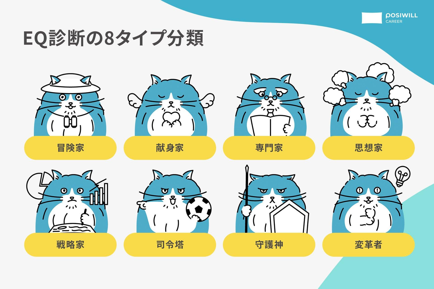 今回のEQ診断を通じて、習慣化された行動特性から8つのタイプに分けておりますので、現在の自分に向いているキャリアの方向性をつかんでいただければと思います。診断のための質問数も極力少なくしており、ストレス無い状態で受けていただけます。また、この診断によるタイプは働く立場や経験によって変化していくため、現状を可視化していると認識いただければ幸いです。