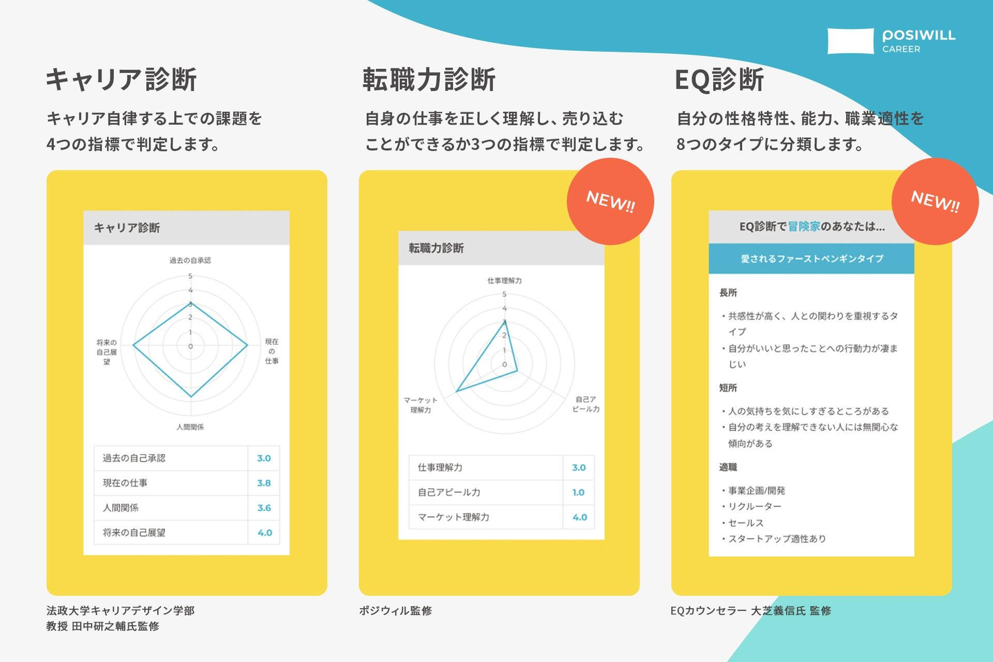 ポジウィルが培ってきた豊富なキャリア開発に関する研究と専門知識を結集したオンライン診断ツールです。現在有料ユーザー向けに提供している、法政大学キャリアデザイン学部教授 田中研之輔氏監修の「ポジキャリ診断」に対し、ポジウィルが監修した「転職力診断」とEQカウンセラーである大芝義信氏が監修した「EQ診断」の要素を加え、新たに開発しました。