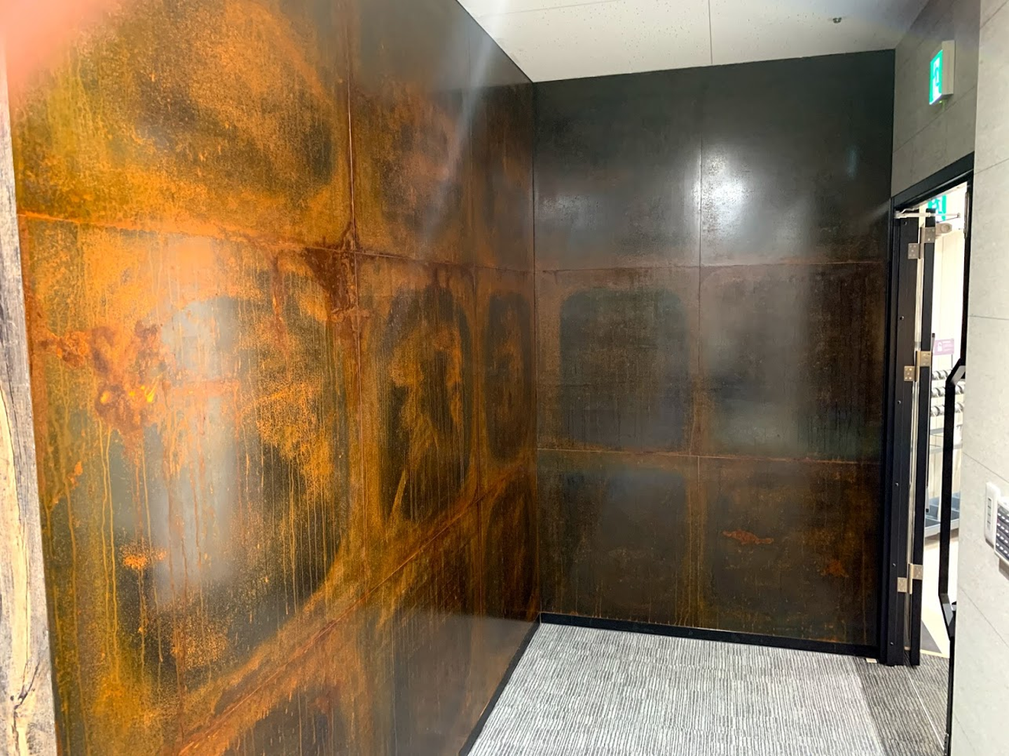 鉄板を錆びさせて、こんな風合い出したらしいですよ。