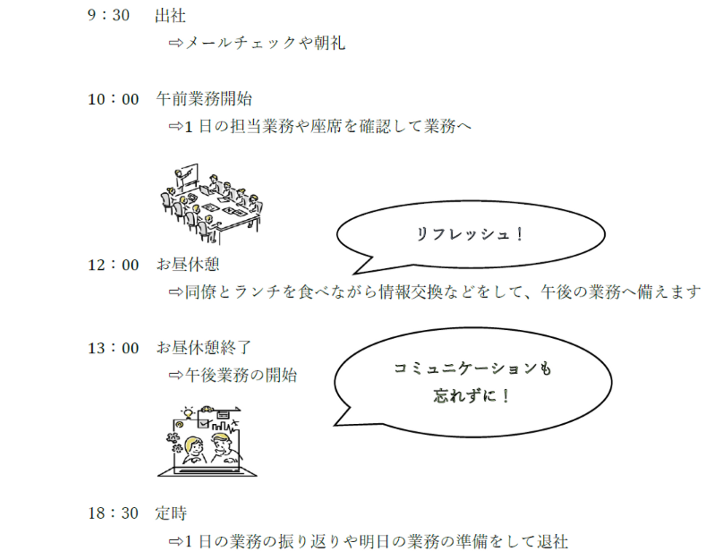 M:シフト制で、早番は9:30〜18:30、遅番は11:30〜20:30です。早番の1日のスケジュール例を紹介します。