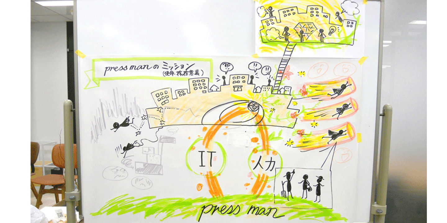 プレスマンのミッションは、柔軟であり広がりを持つ抽象的なものなので、グラフィックにするのはとても大変だと思っていたのですが、さすがプロ、社長のトークを的確にキャッチしてくれました。