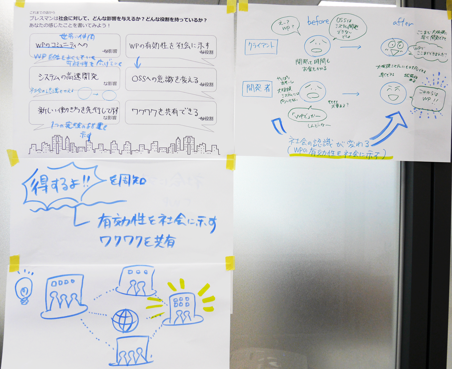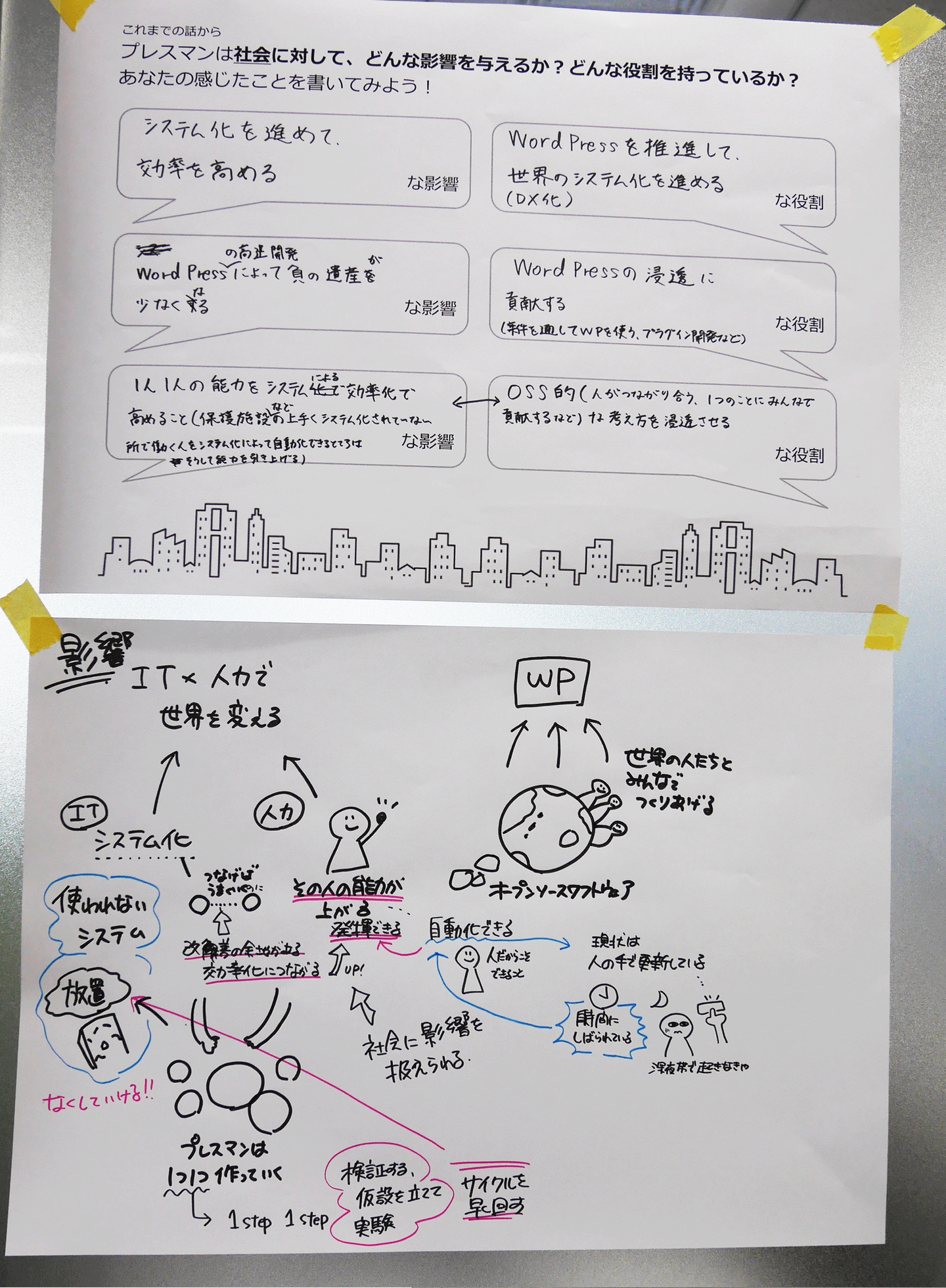 例えば、WardPressで世の中が良くなると漠然と書いていたものを、絵にしてみて、この人はどう感じていると思う?など、視点を変え具体的に、「なぜ」に対する答えを導いていきました。