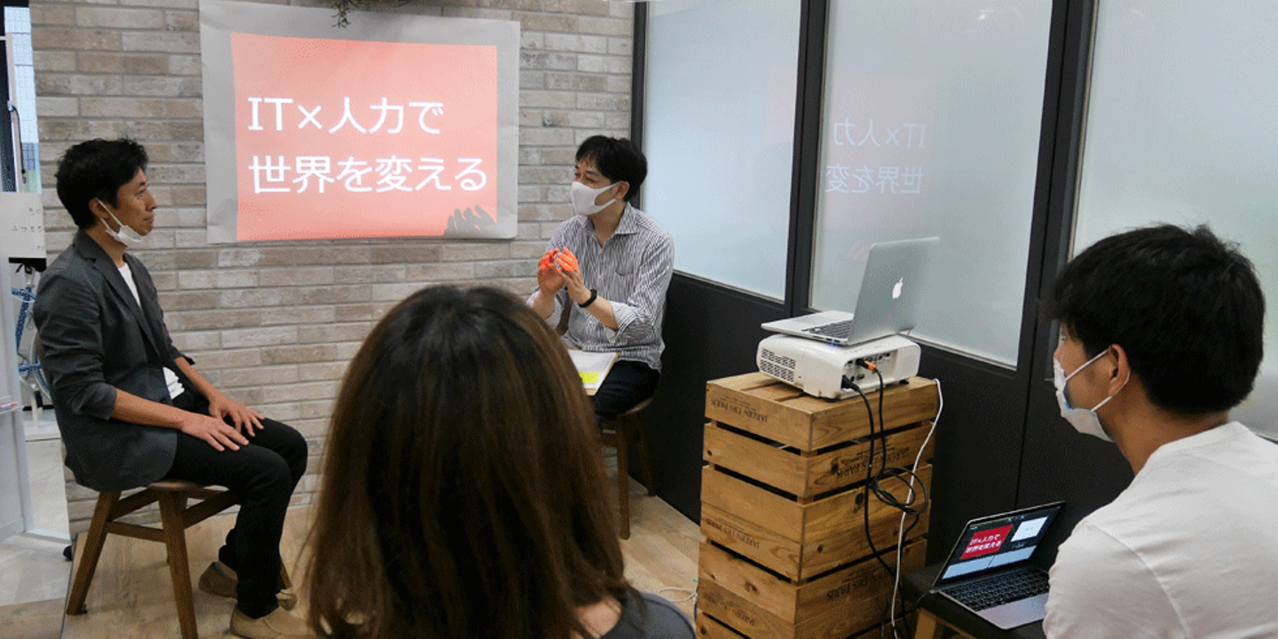 そして、場が温まったところで本題の社長によるアウトプットトーク。「IT×人力で世界を変える」というミッションについて、ファシリテーションの尾形さんがグイグイ質問をし本質に迫っていきます。