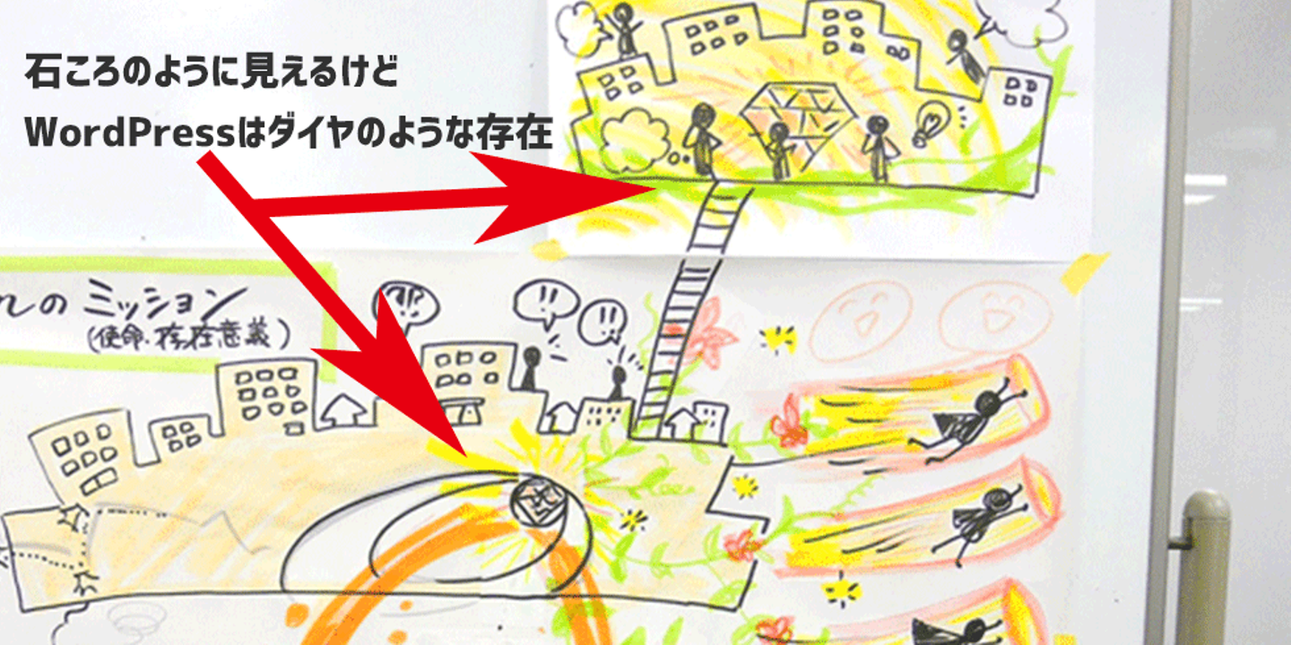 WordPressはブログツールとして使われることが一般的ですが、プレスマンでは大規模基幹システムに利用したりと、あまり主流(当たり前)ではない使い方をしています。WordPressで世界を変える、ここではそういった話を中心にミッション・ビジョンの話をまとめた図が完成しました。