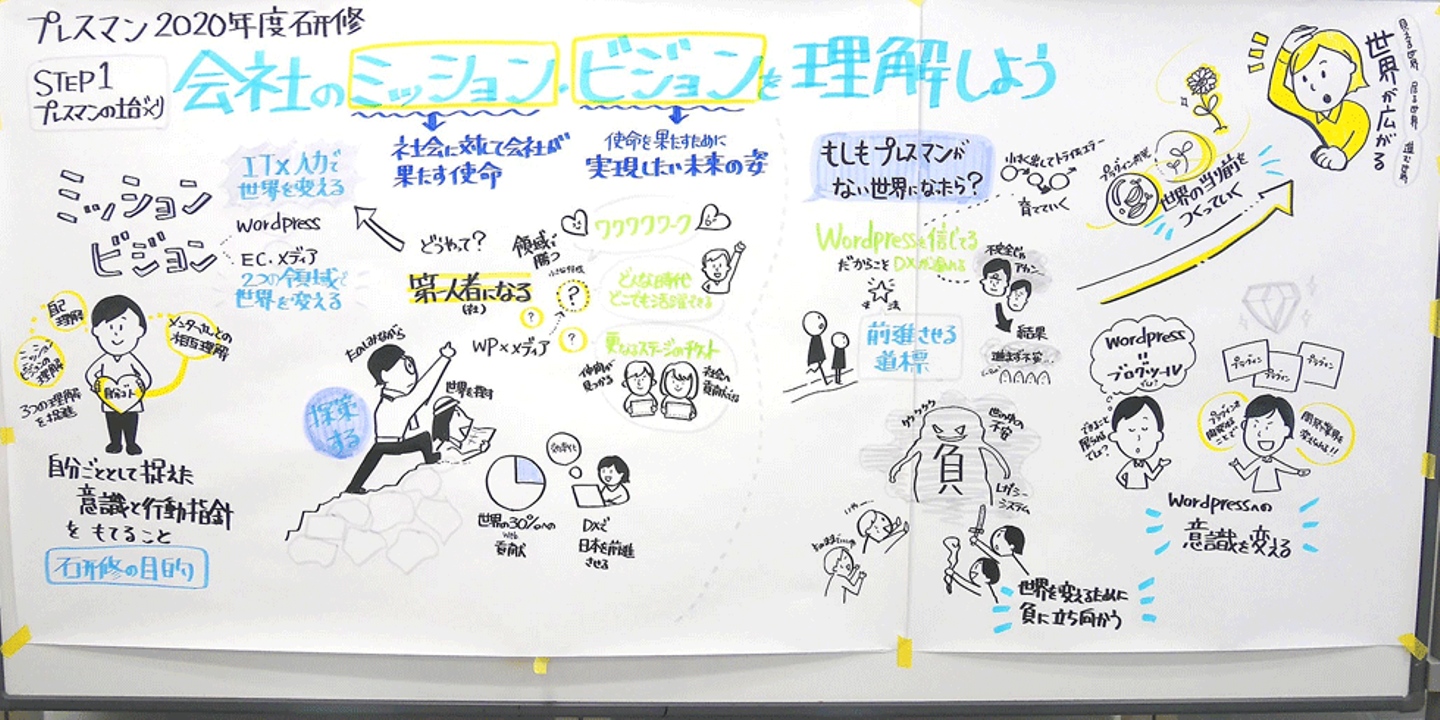 今回は、社長から直接ミッション・ビジョンのお話を聞き、新入社員がどう受け取ったかをアウトプットしながら、絵に落とし込み、その絵を見ながら理解を深めていきます。