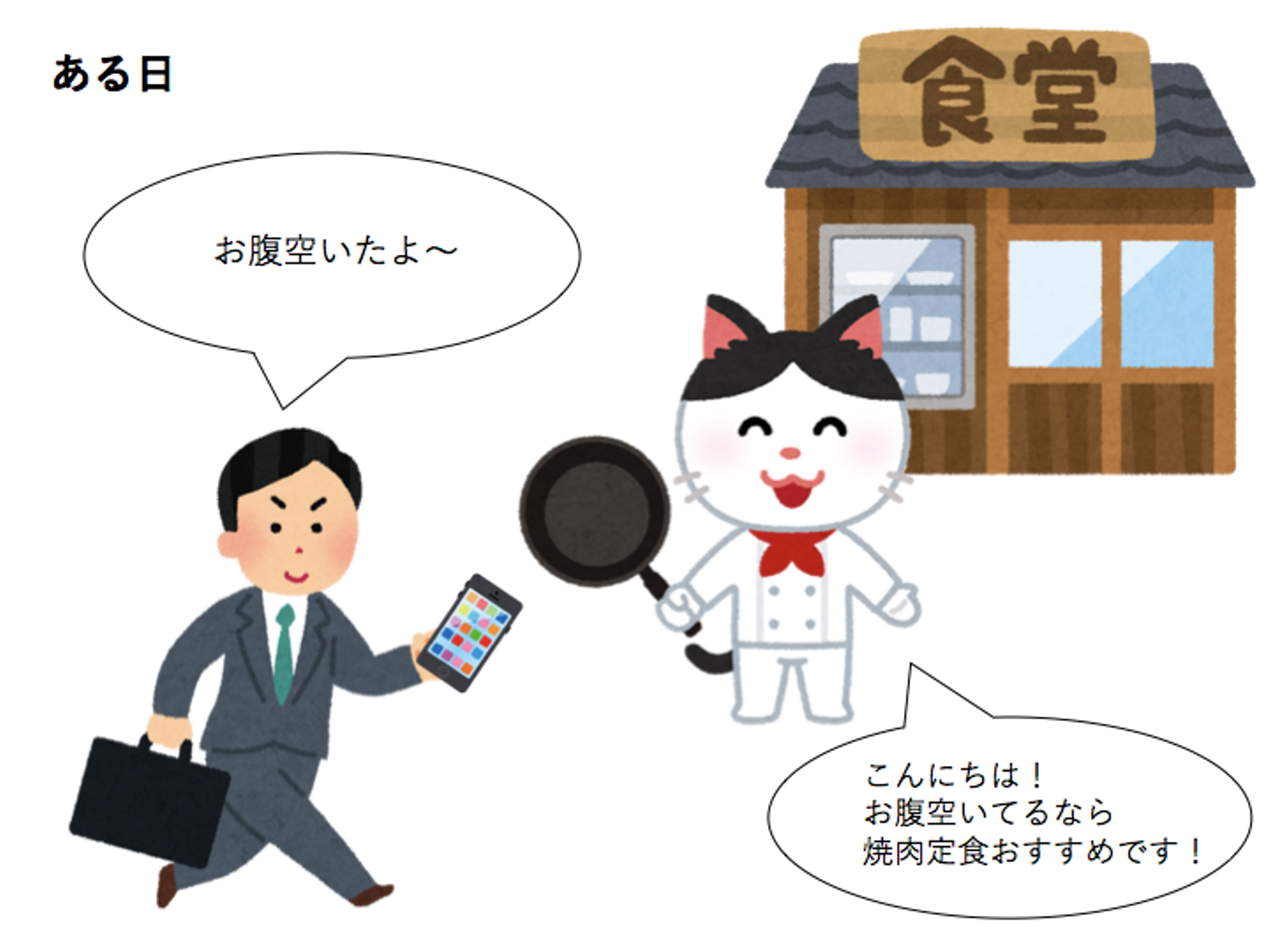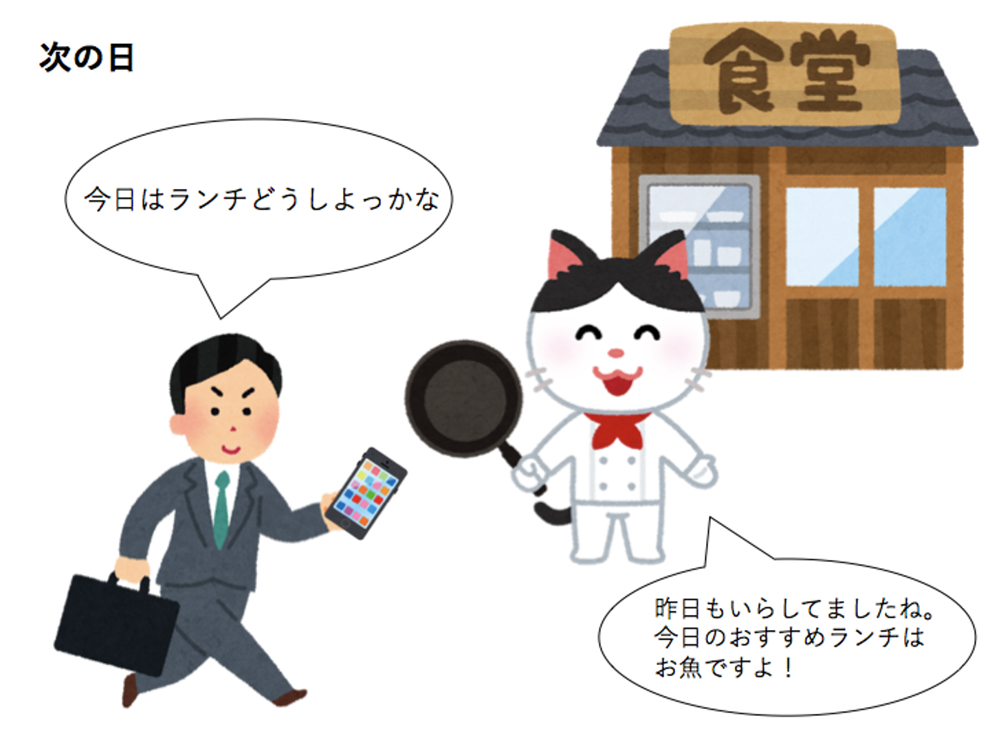 他にも、たとえばある飲食店の前に紐付いたARキャラクターが、客引きとしていたとします。あなたはこのARキャラクターをアプリを通して呼び出し、会話します。そして次の日そのお店の前に行ってもう一度ARキャラクターを呼び出すと、「昨日もいらしてましたね。今日のおすすめランチはお魚ですよ!」などと提案をしてきます。