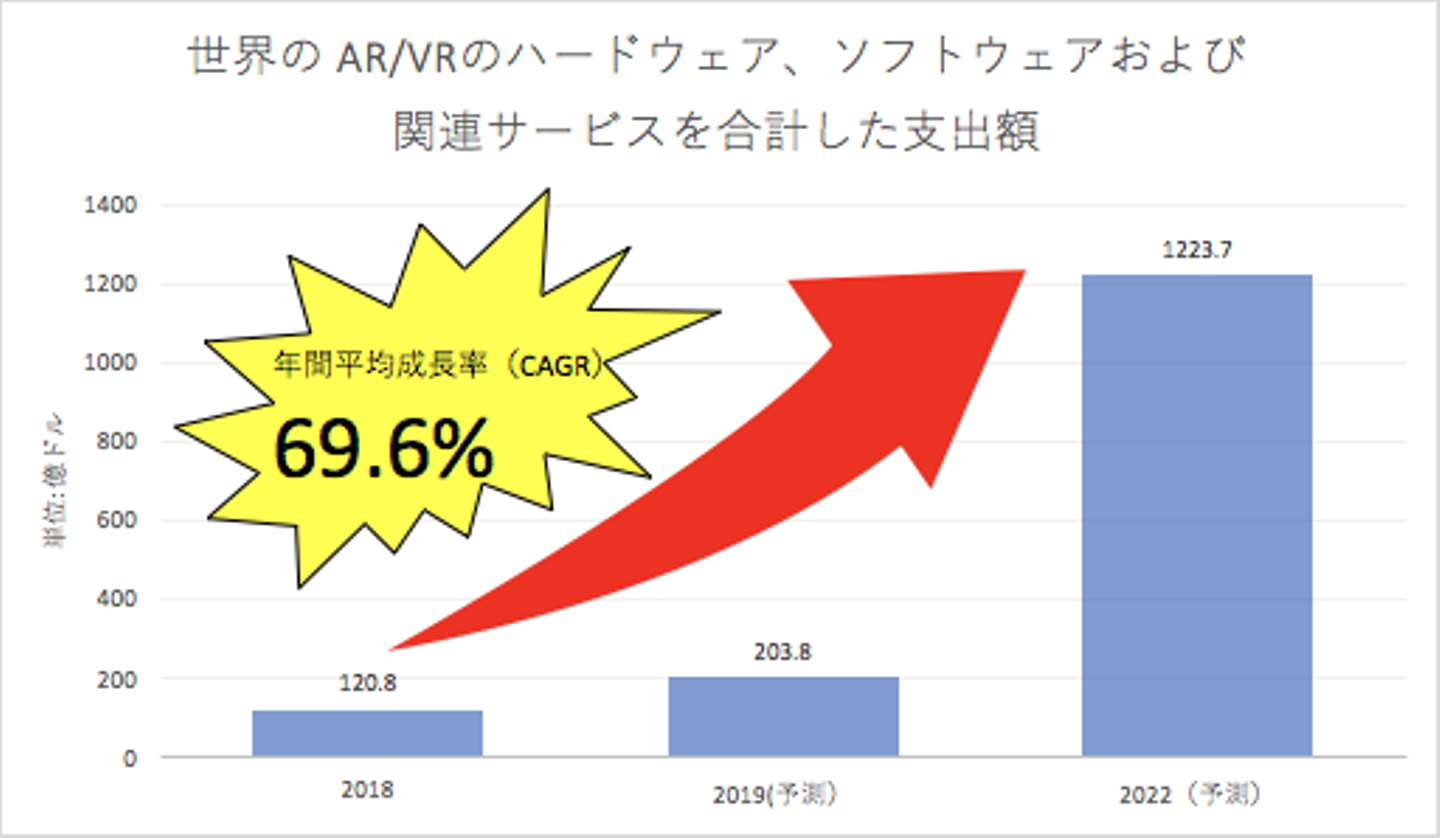 AR業界全体の話に移っていきます。2018年12月21日に発表されたIDC Japan 株式会社による市場予測によると、世界のAR/VRのハードウェア、ソフトウェアおよび関連サービスを合計した支出額は2019年は203.8億ドル、2022年には1223.7億ドルに達する見通しで、2017年~2022年の年間平均成長率(CAGR:Compound Annual Growth Rate)は69.6%と高い成長が見込まれてます。