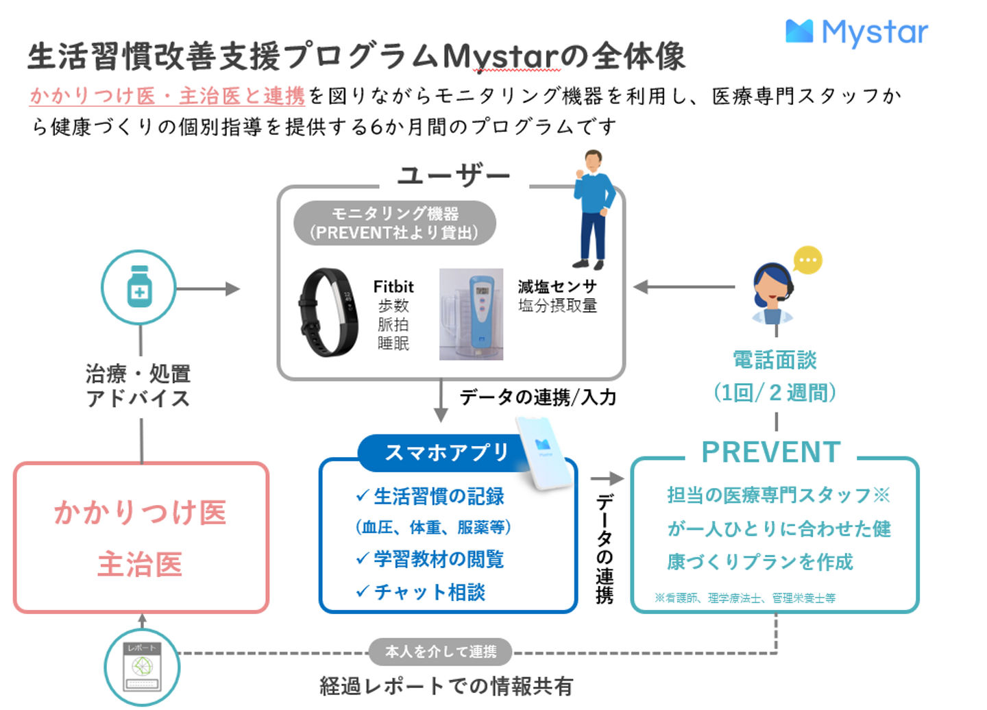 Mystarはユーザー様にモニタリング機器をご使用いただき、専属の医療サービス部スタッフ(看護師、管理栄養士、理学療法士等)がマンツーマンで健康づくりのサポートをする6か月間のプログラムです。