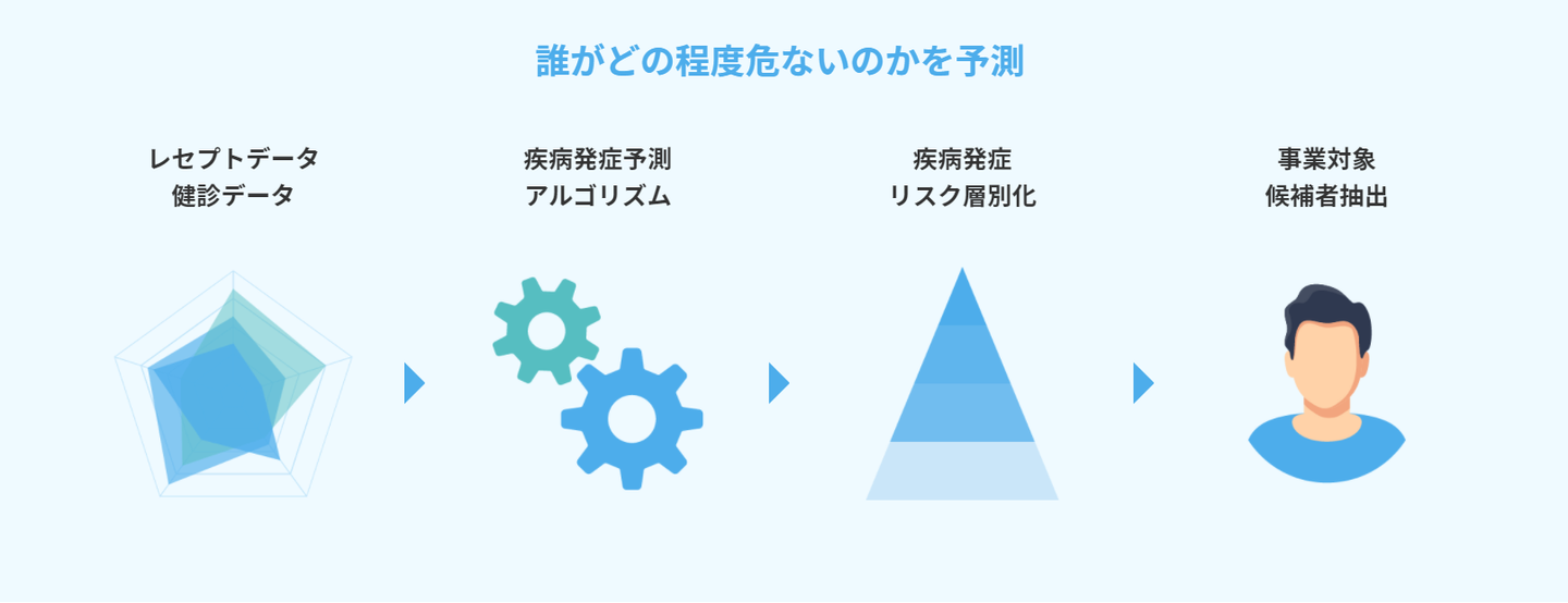 PREVENTの生活習慣病重症化予測モデルを用いることで、レセプトデータ(※1)ならびに特定健診結果より、一人ひとりの5年以内の生活習慣病の重症化イベント発生率(※2)を算出することができます。