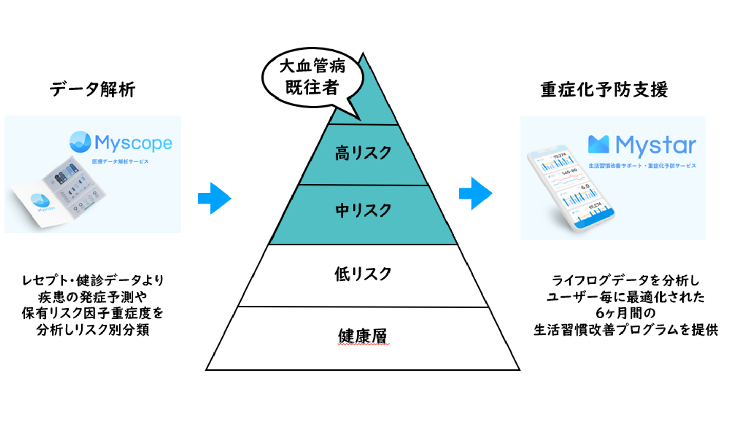 つまり!「Myscopeで対象者を抽出し、対象の方に対してアプリを使用した重症化予防支援プログラムMystarを提供する」流れがPREVENTの事業の全体像となります。