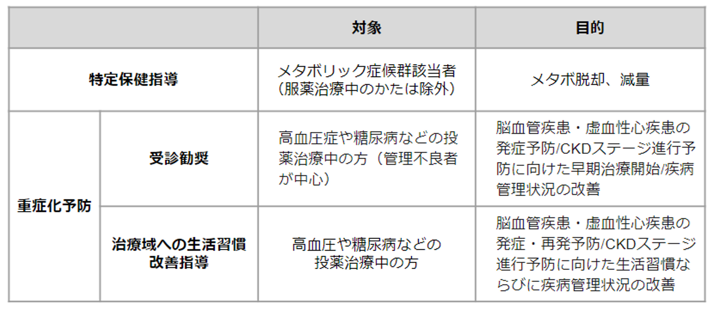 重症化予防では、高血圧症や糖尿病などの治療中の方を対象にしており、生活習慣病の重症化予防をサポートすることで脳梗塞や心筋梗塞などの脳血管疾患・虚血性心疾患の発生・再発予防に着目して行われています。