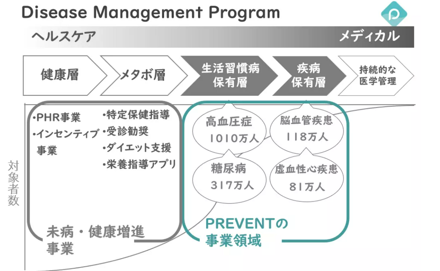 PREVENTが行う重症化予防では、脳梗塞や心筋梗塞の既往者(三次予防)、高血圧症や糖尿病などの投薬治療中の方(二次予防)を対象にしています。