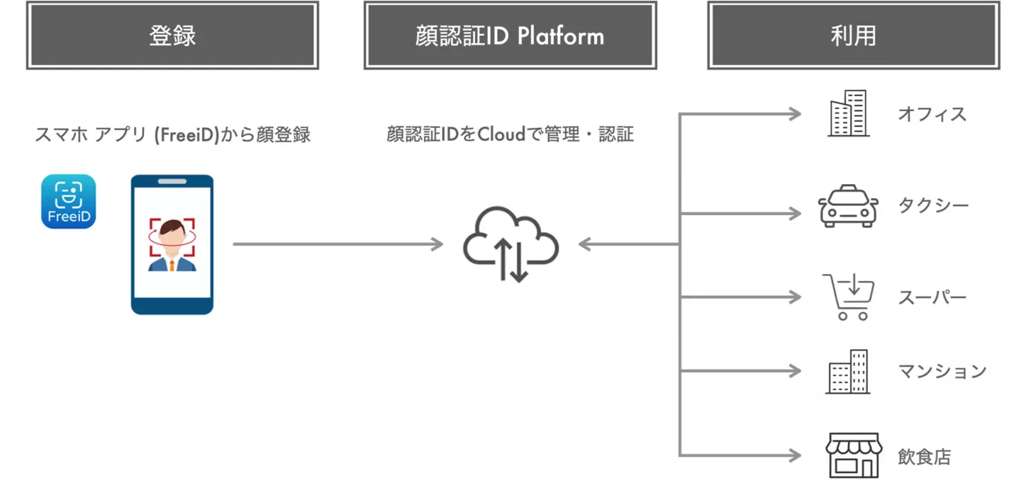 いままでの顔認証サービスは、一つ一つのデバイスに毎回顔を登録しなければいけませんでした。「FreeiD」は、一度アプリに顔を登録すれば、「FreeiD」が使われている場所ならどこででも利用できるのが特徴です。マンションやオフィスなら開錠、お店なら決済等を、非接触でスムーズかつ安全に行うことができます。