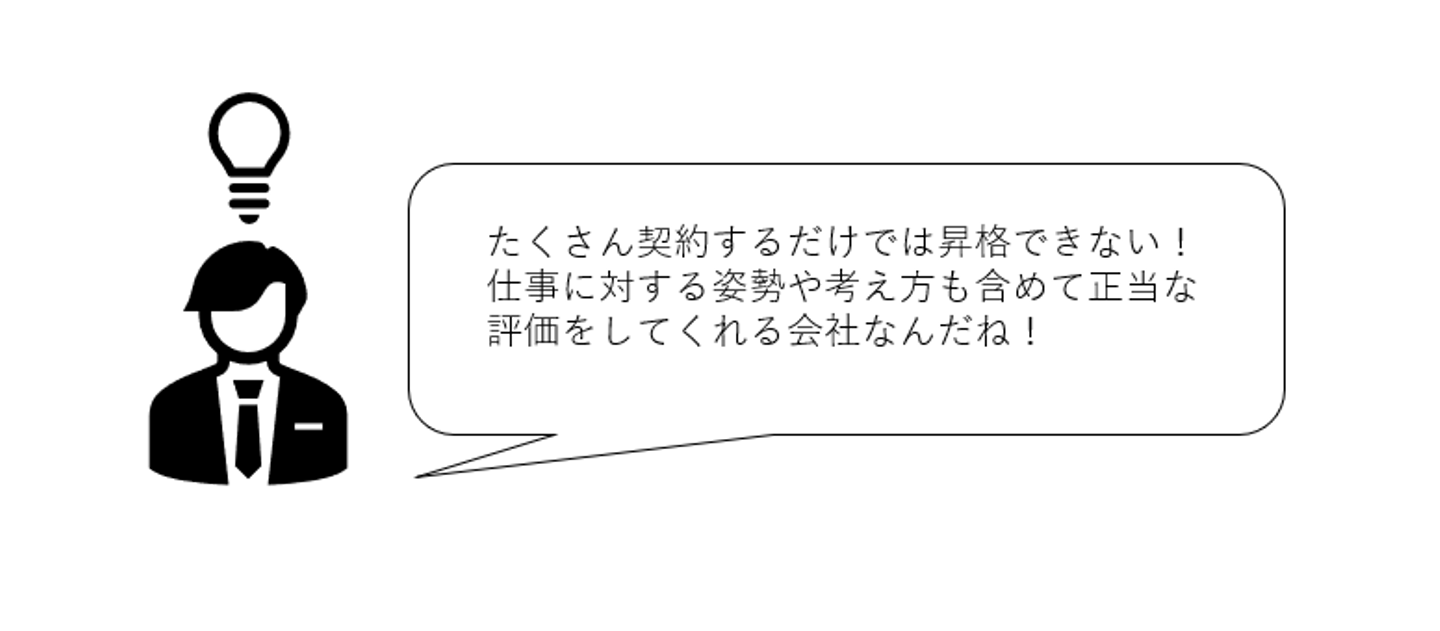 当社の営業部は、半年に1回昇格のチャンスがあり、最短1年で課長に昇格可能な評価制度となっています。昇格の基準は、①契約件数②バリュー評価の点数です。これらを一定基準満たしていると昇格が出来る制度となっています。