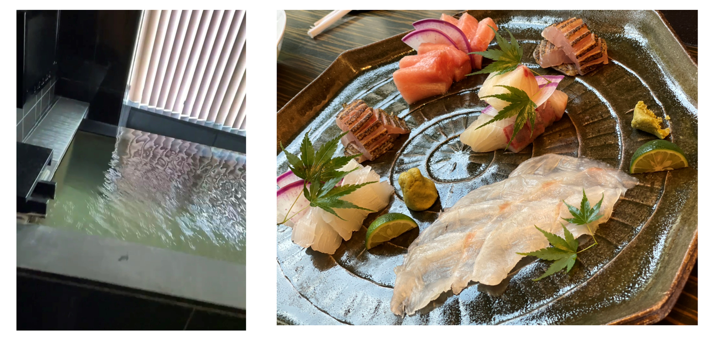 左:お部屋付きの温泉 右:コースのお刺身 ■CASE2:エクシブ山中湖