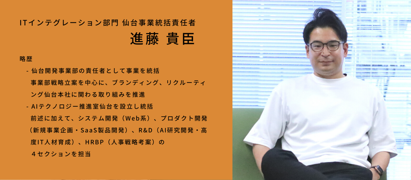 入社後は、私たちと同じ『AIテクノロジー推進室 仙台』に所属してもらう予定です。私たちは「世の中の人々にとっての新しい “ 当たり前 ” を創る」をミッションに、既存事業であるシステムインテグレーション+新規サービス/事業開発を行う組織です。