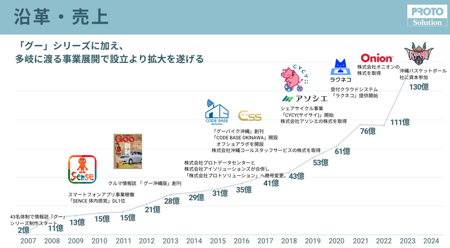 (2007年度〜2024年度 プロトソリューショングループの沿革・売上推移)