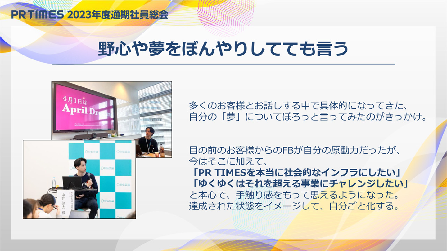 今までは、目の前のお客様からのフィードバックが自分の原動力だったのですが、そこに加えて自分の夢でもある「PR TIMESを本気で社会的インフラにしたい」「ゆくゆくはそれを超える事業にチャレンジしたい」といったことへも深く向き合えるようになりました。