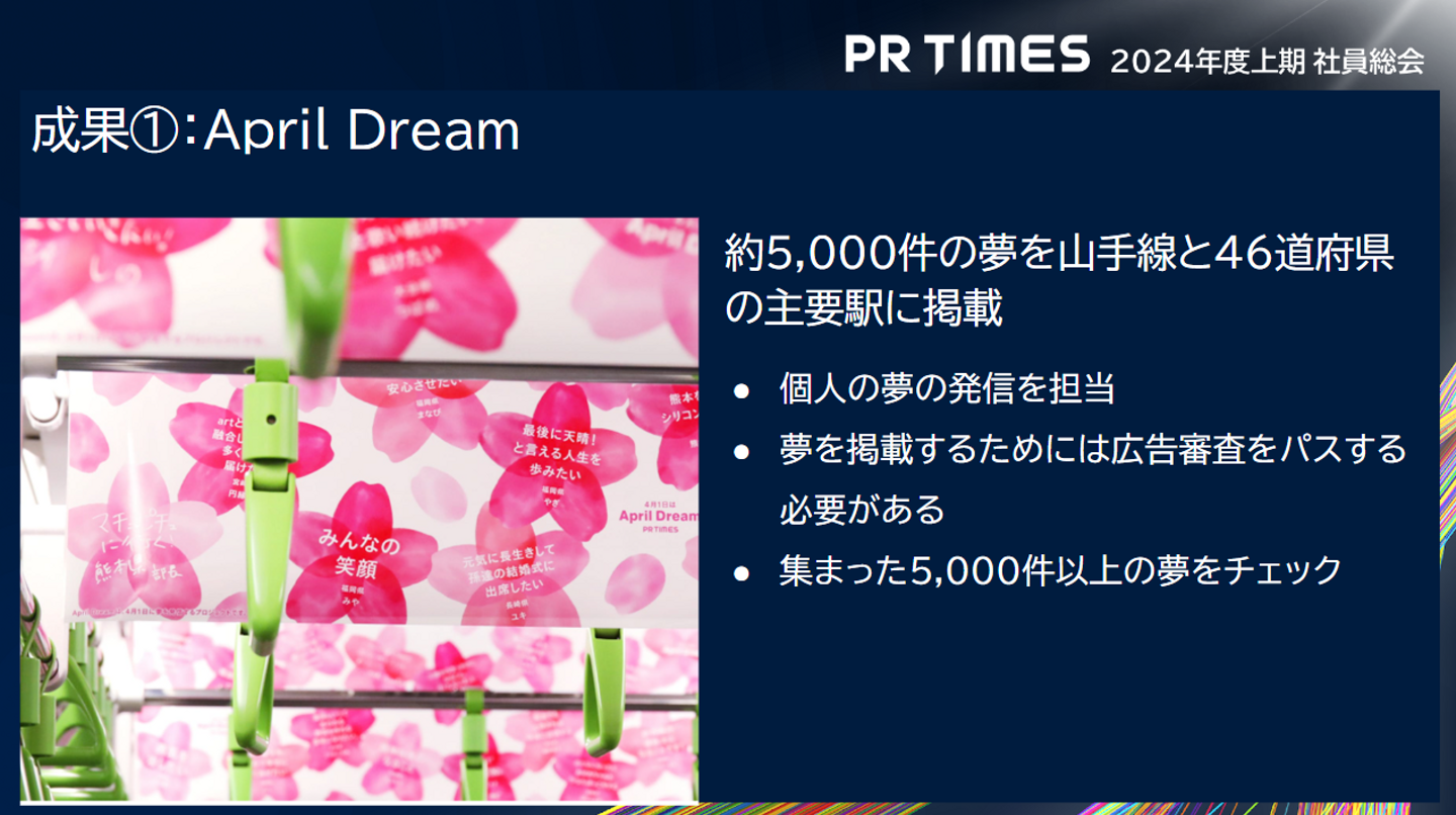 AprilDream自体は2020年から毎年おこなっているものですが、2024年は山手線の11車両の広告スペースに全国から集まった一人ひとりの夢を載せようという新たな施策を行いました。この夢の掲載審査を私が担当したというものです。