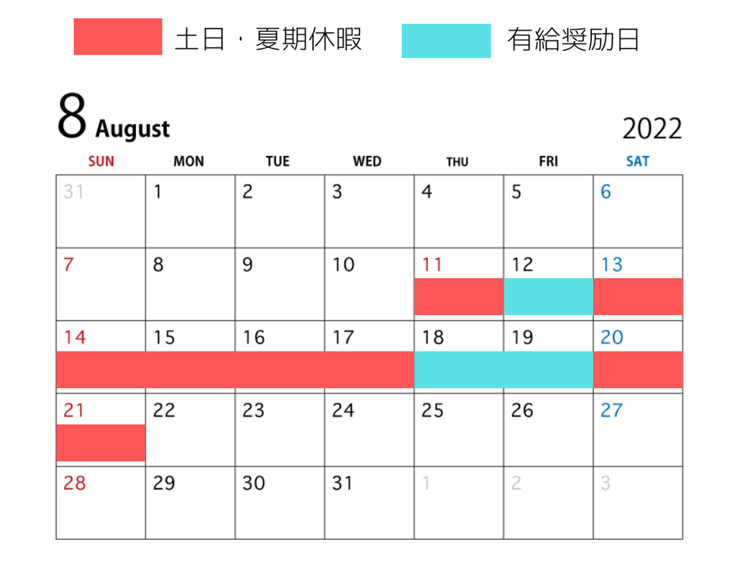 万が一15~17日に業務が入ってしまった場合でも、7~9月までの期間に夏期休暇として3日間のお休みが取得できますので、全社員がしっかりと休める仕組みとなっています。