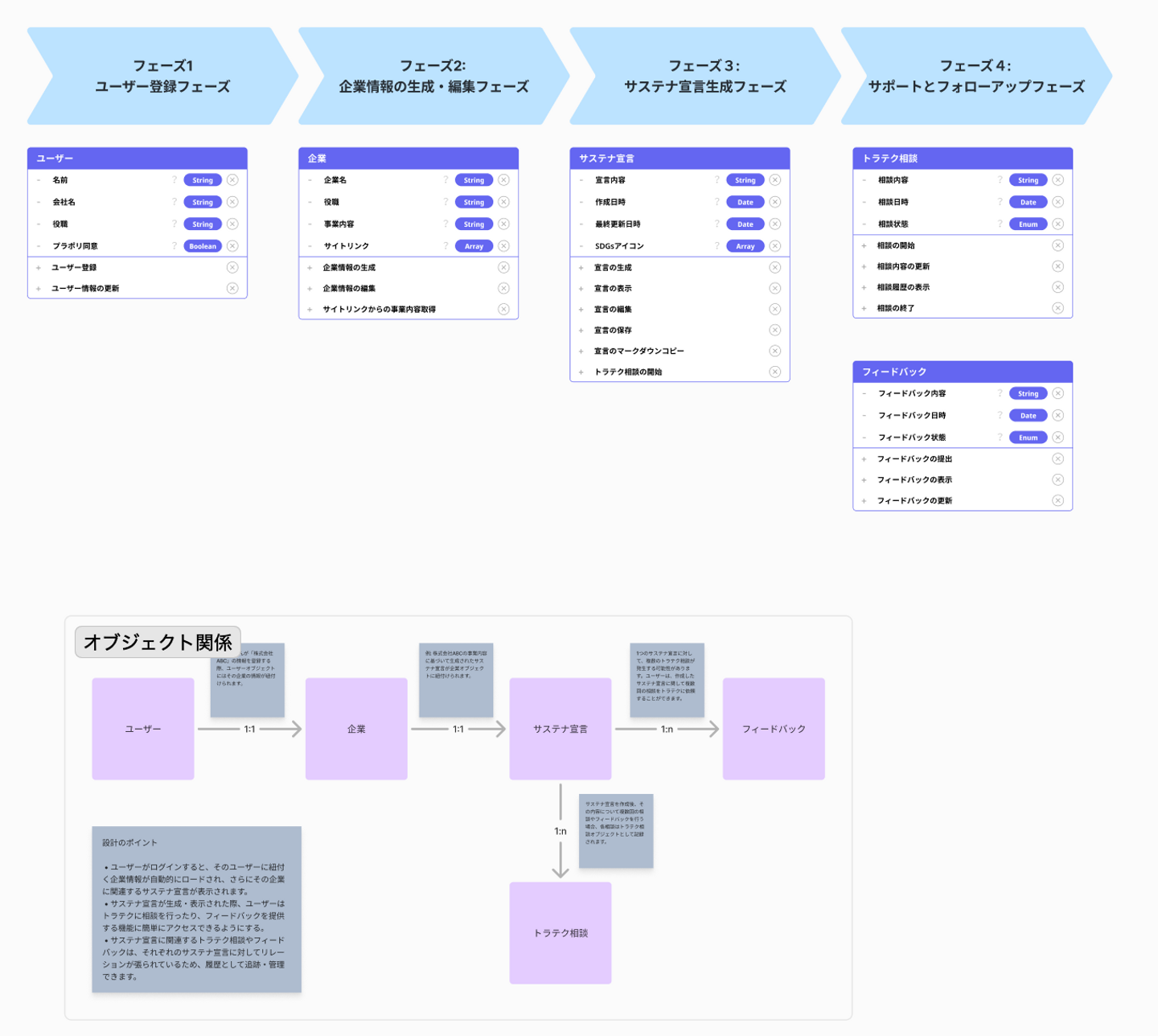 ユーザージャーニーを通じてTrash Technologies様と認識を合わせた内容をもとに、UIのモデリングとオブジェクト分析を作成しました。