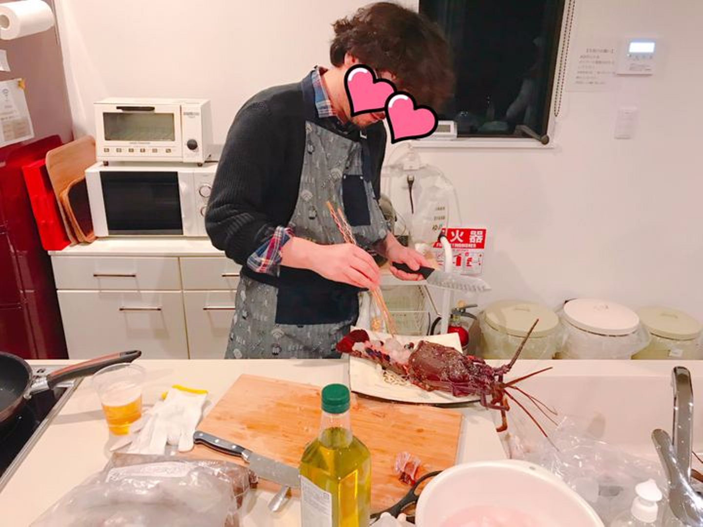 ↑ MYエプロン持参。彼はリブロースも仕込んで持ってきてくれました。美味すぎました。そして伊勢海老の頭でリゾットを作ってくれ、翌朝は伊勢海老のおダシでお味噌汁を作ってくれました。卍。