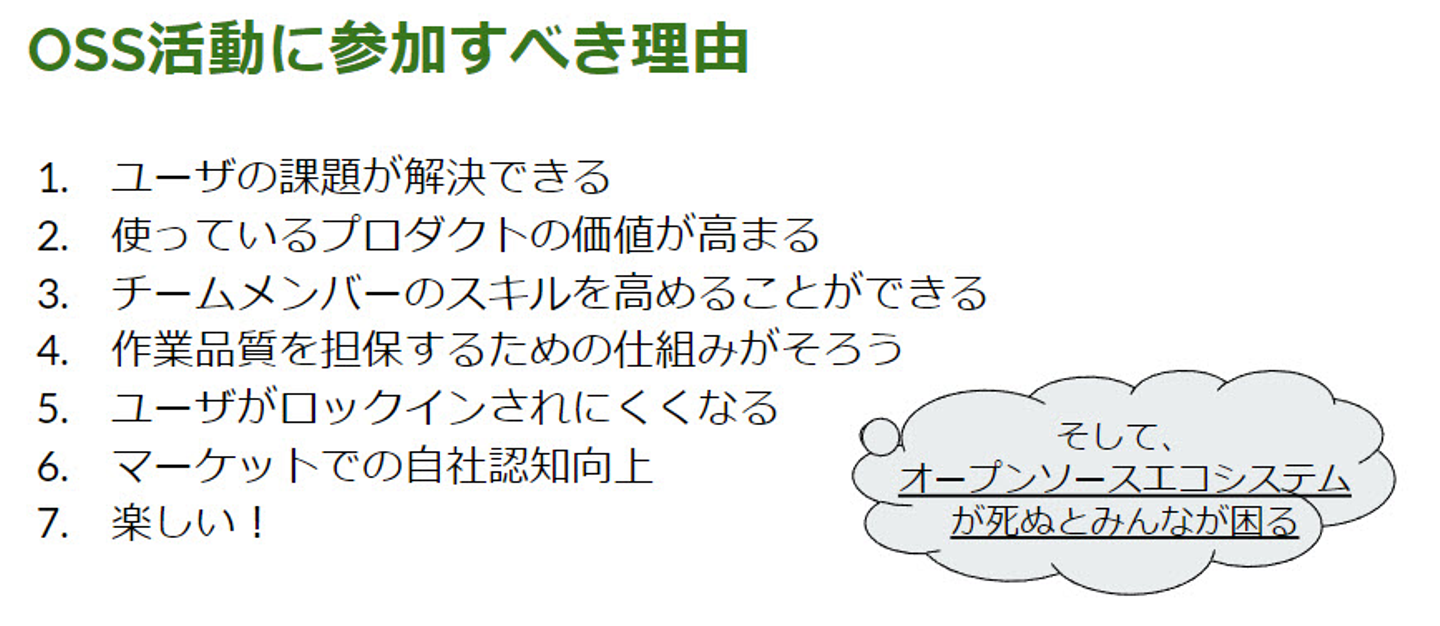 ですので、コタエルとしてはあえて、この崩れがちなバランスを持ち直す方向で発信すべき、という立ち位置をとっています。今回のイベントを皮切りに、OSS活動への参加に興味があるプレイヤーを具体的にサポートする動きをとっていくつもりです。また、ユーザ向けにも啓蒙活動というと偉そうですが、オープンソースの本質である「情報がオープンに流通する仕組み」から派生するメリットを、引き続き自らの行動を通じてお伝えしていければと思います。