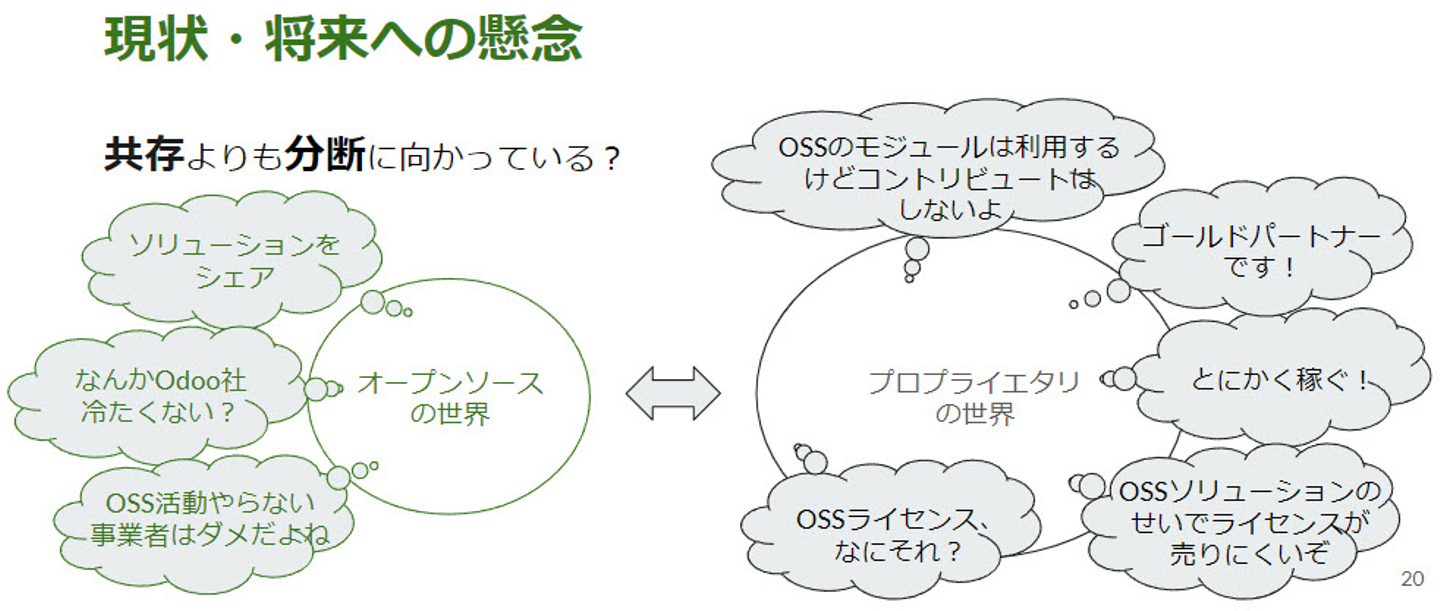 1) Odooはオープンソースであることの利点を活かして成功したプロダクトでありつつも、昨今は「オープンソースの世界」と「プロプライエタリの世界」のバランスが崩れてきている(「共存」から「分断」に向かっている)