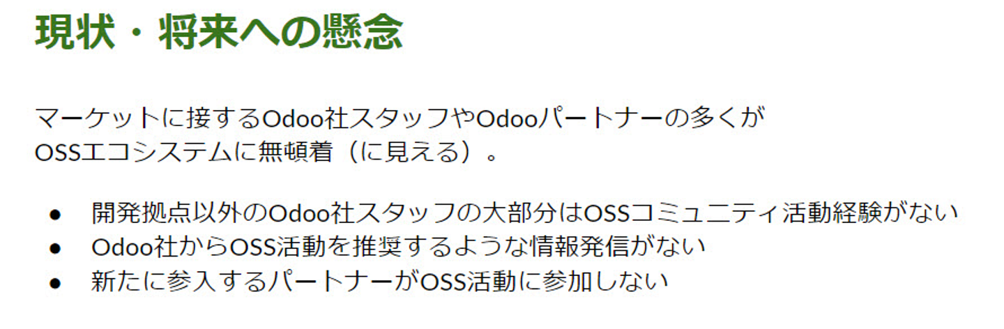本来であれば、Odoo社からエコシステム全体を俯瞰してOSS活動の側面含めナーチャーする動きをとるなり情報発信するなりの動きがあるとよいのだとは思います。特に日本ではOSS活動が根付く前にプロプライエタリ側が拡大し始めたこともあり、マーケットに出る情報のバランスが崩れがちです。