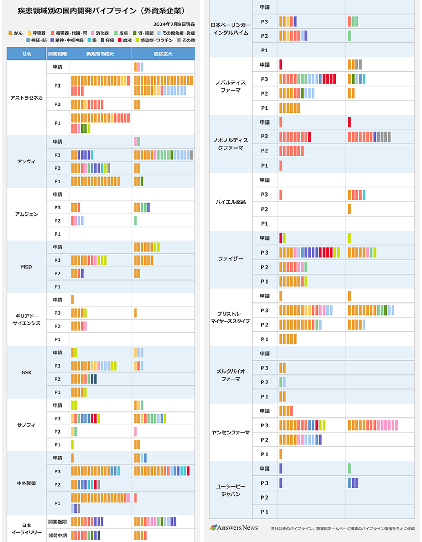 例…主要製薬企業の新薬開発状況をまとめた図。各社の決算資料など「文章」データから読み取るしかなかった情報を、一覧表で把握できる利便性がSNSでも話題に。