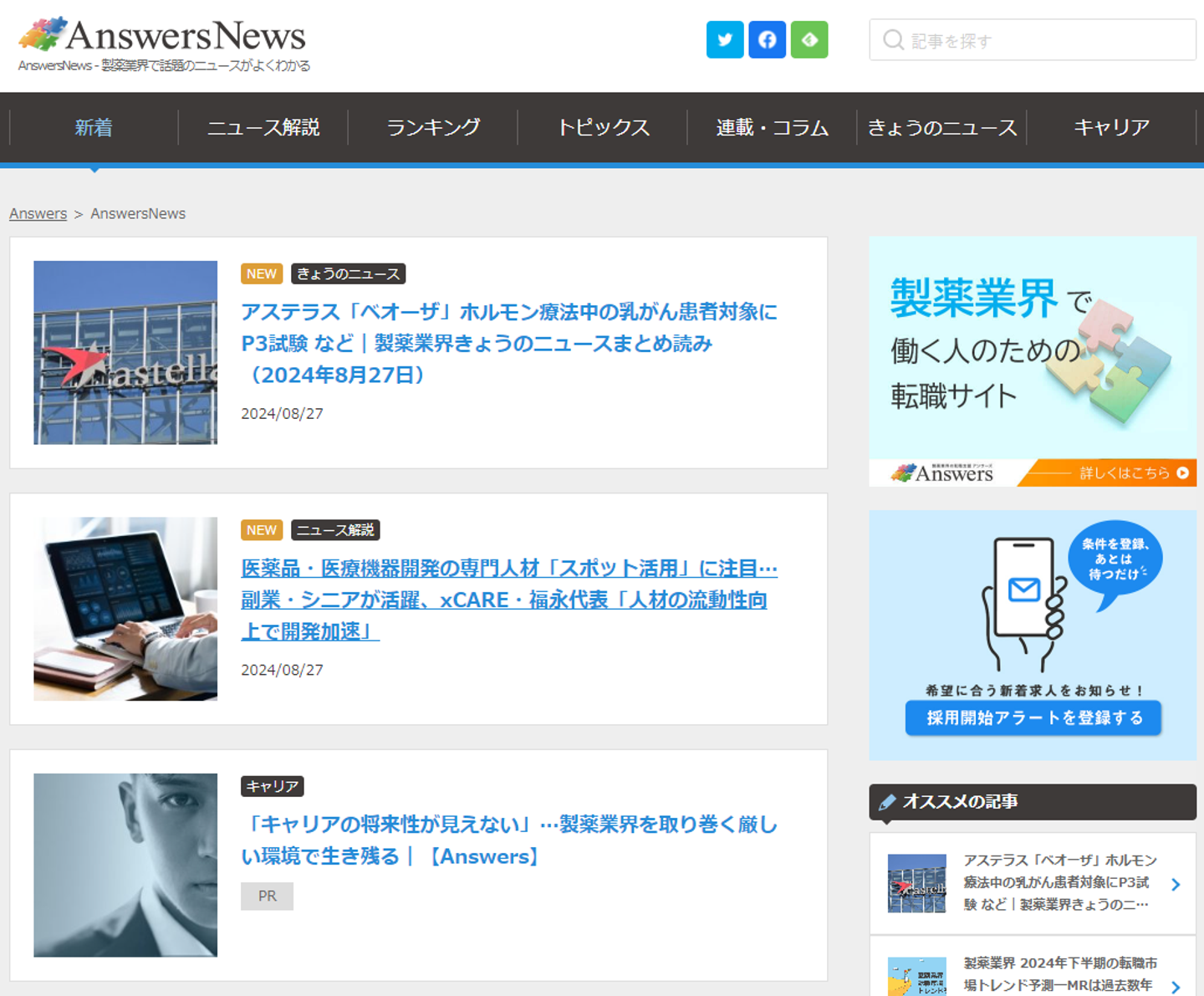 『AnswersNews』は、「話題のニュースがよくわかる」をコンセプトに、製薬業界に関する解説記事を提供する、ニュース解説メディアです。