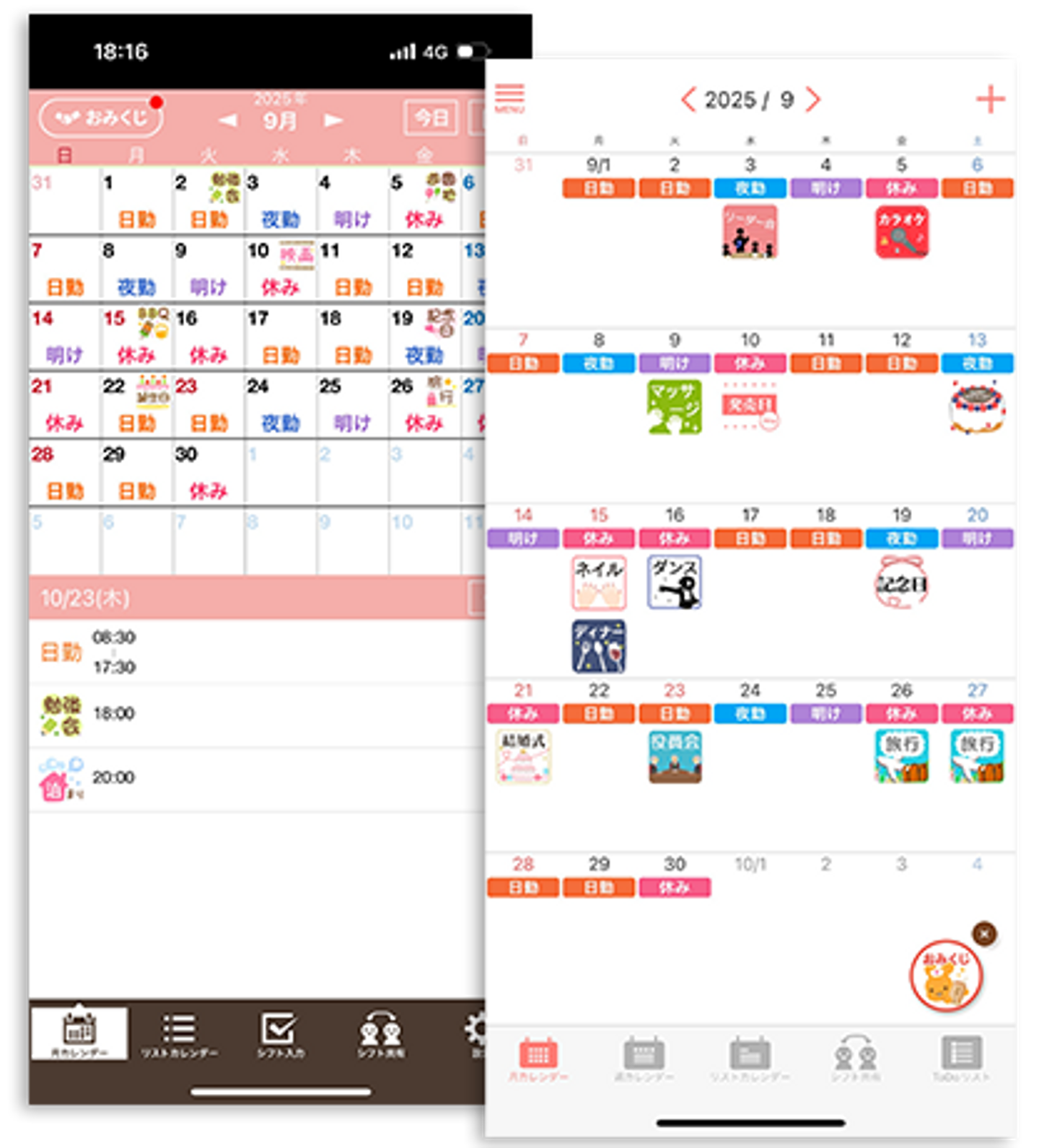 「職場に貼り出されるシフト表を手帳に書き写すのが大変」という看護師の声から生まれたアプリで、「日勤」「夜勤」「早番」等のスタンプを使ってシフトを簡単に入力できる利便性や、グループを作成して友達とシフトをシェアできる「シフト共有機能」が特徴です。